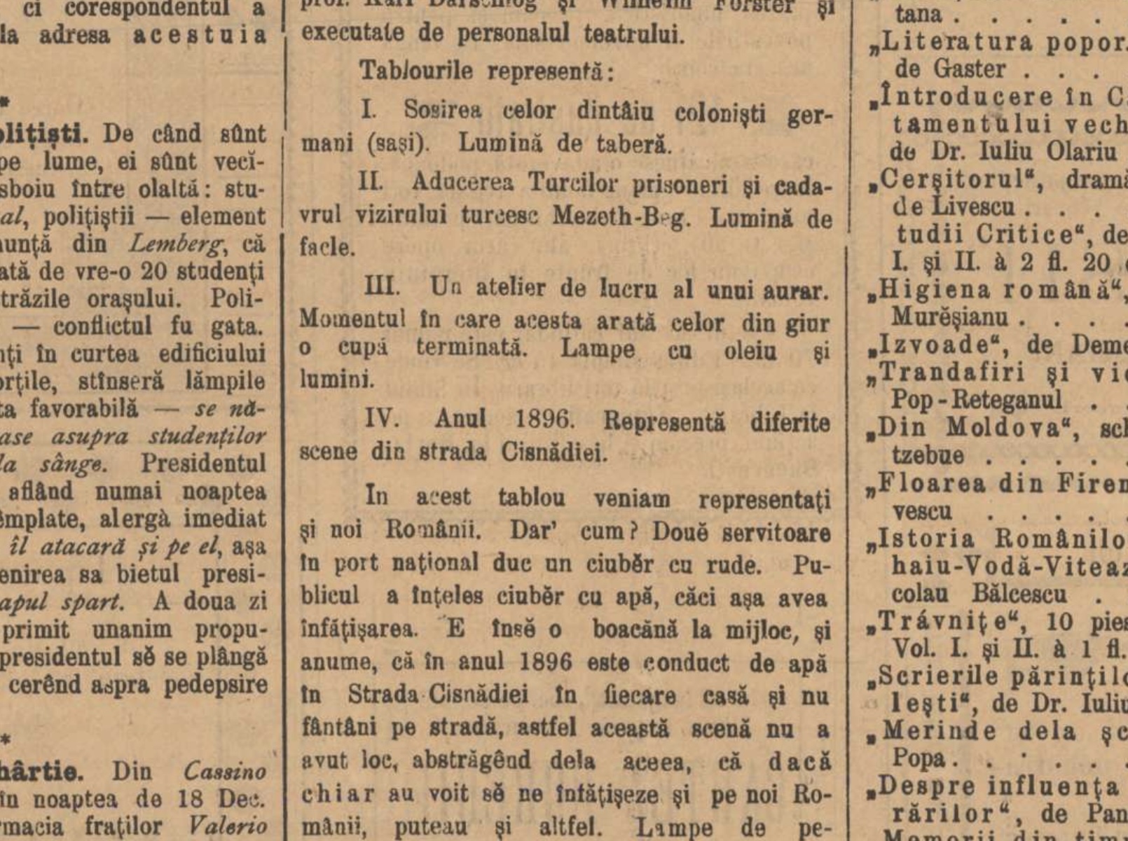 ”Representaţia festivă s’a ţinut la lumina electrică, deschizându-se printr’un prolog compus de domnul profesor Gustav Schuller.