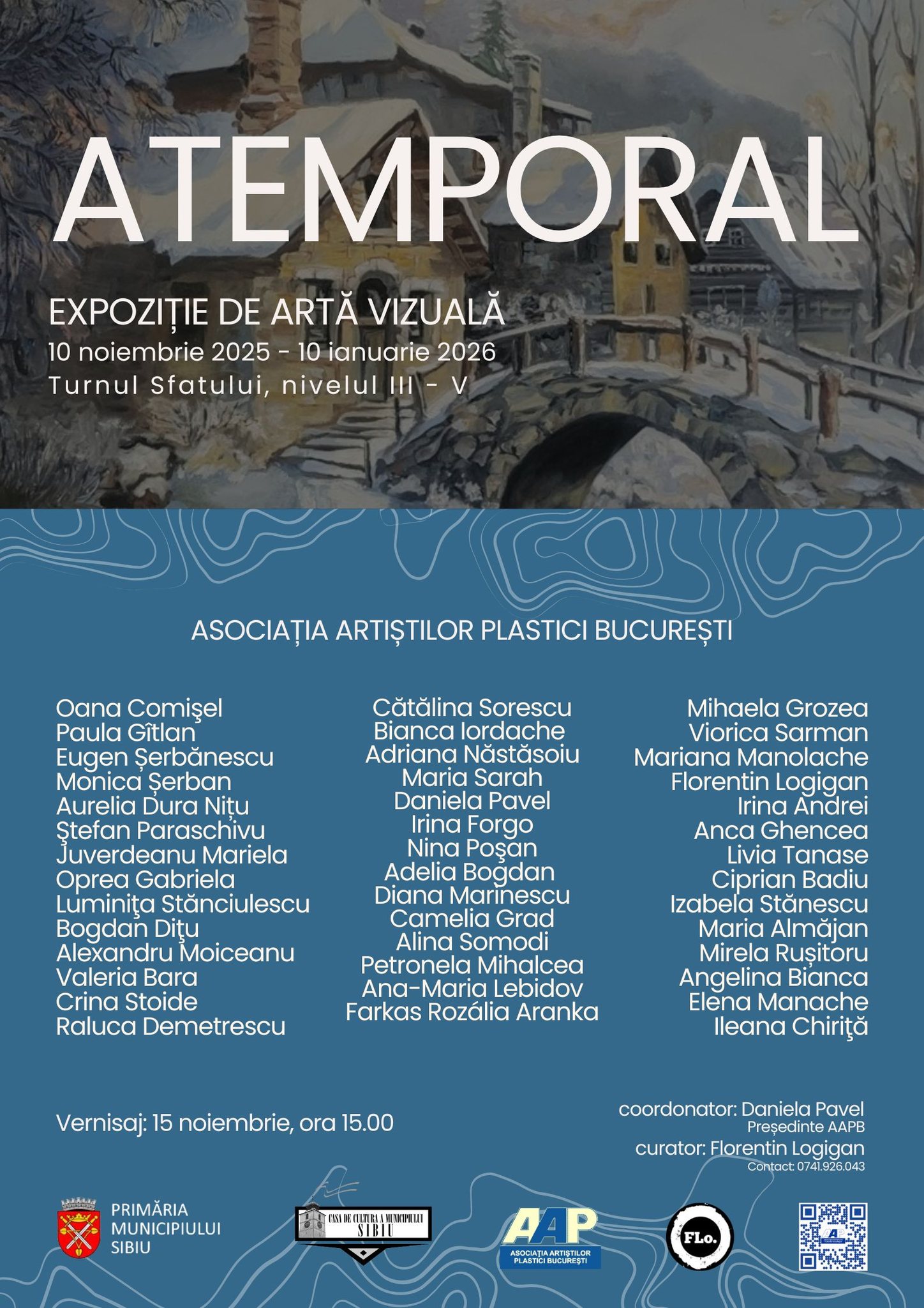 Asociația Artiștilor Plastici București (AAPB) are onoarea de a prezenta publicului sibian și vizitatorilor o selecție remarcabilă de creații în cadrul expoziției de artă vizuală intitulate ”Atemporal”. Expoziția poate fi vizitată până în 10 ianuarie 2026. Detalii aici.