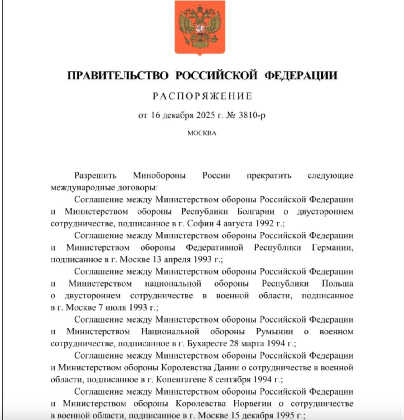 Guvernul Federației Ruse a autorizat Ministerul Apărării să înceteze acordurile militare cu 11 țări europene, semnate în perioada 1992–2002. Un document în acest sens a fost publicat pe Portalul rus de informații juridice, citat de publicația Meduza.io.