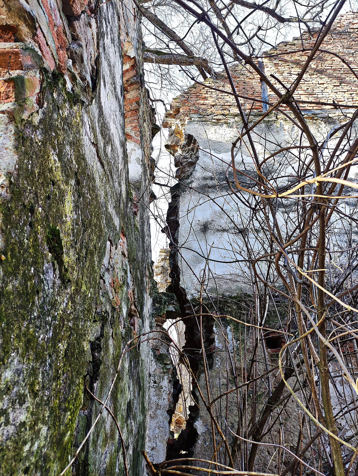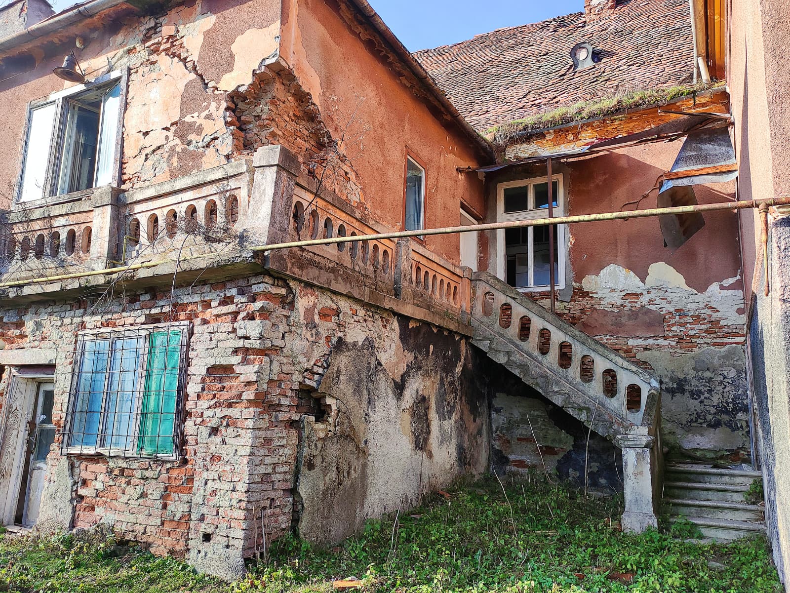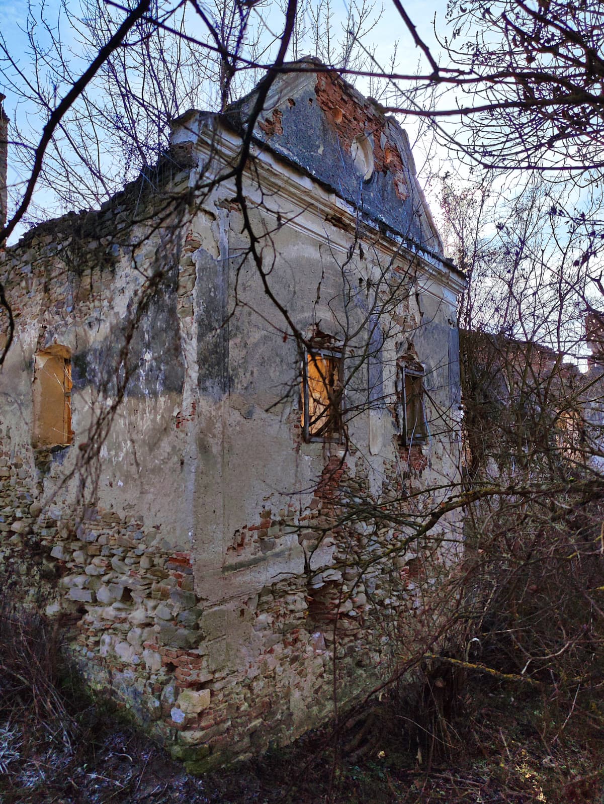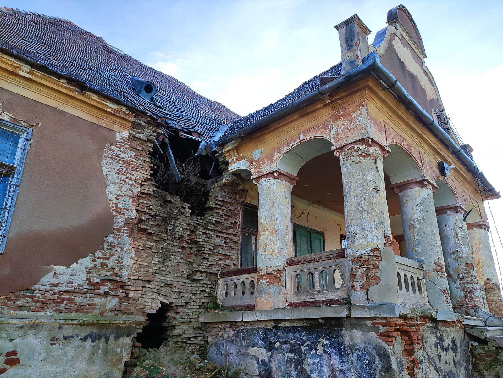 Când treci de poartă, de departe, castelul pare că încă rezistă – e impresionant, mai ales în lumina soarelui. E impunător, cu fronton baroc și acoperiș înalt. Dar apropierea schimbă totul: ziduri decojite, tencuială căzută, ferestre sparte, iar frontonul ondulat, odinioară decor de noblețe, pare acum o mască fragilă peste o clădire „obosită”.