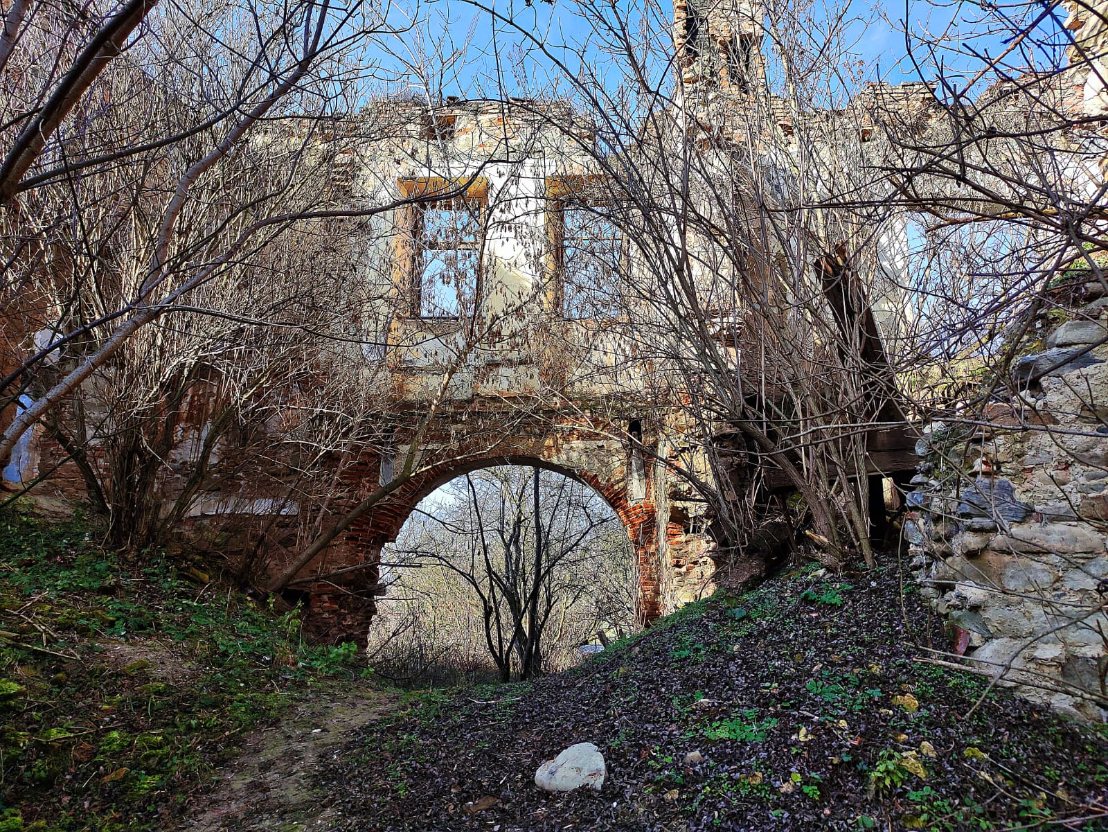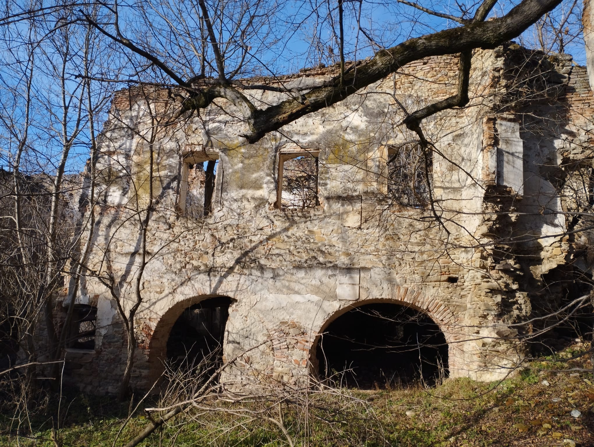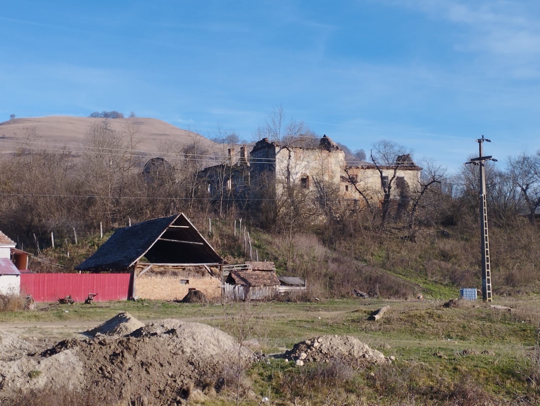 Când pereții apar printre ramuri, imaginea te oprește. Ziduri uriașe, goluri de ferestre, un arc monumental, resturi dintr-o reședință ce ar fi putut domina satul în evul mediu.