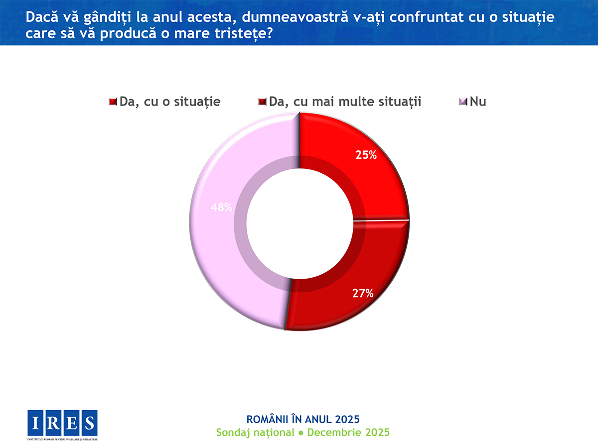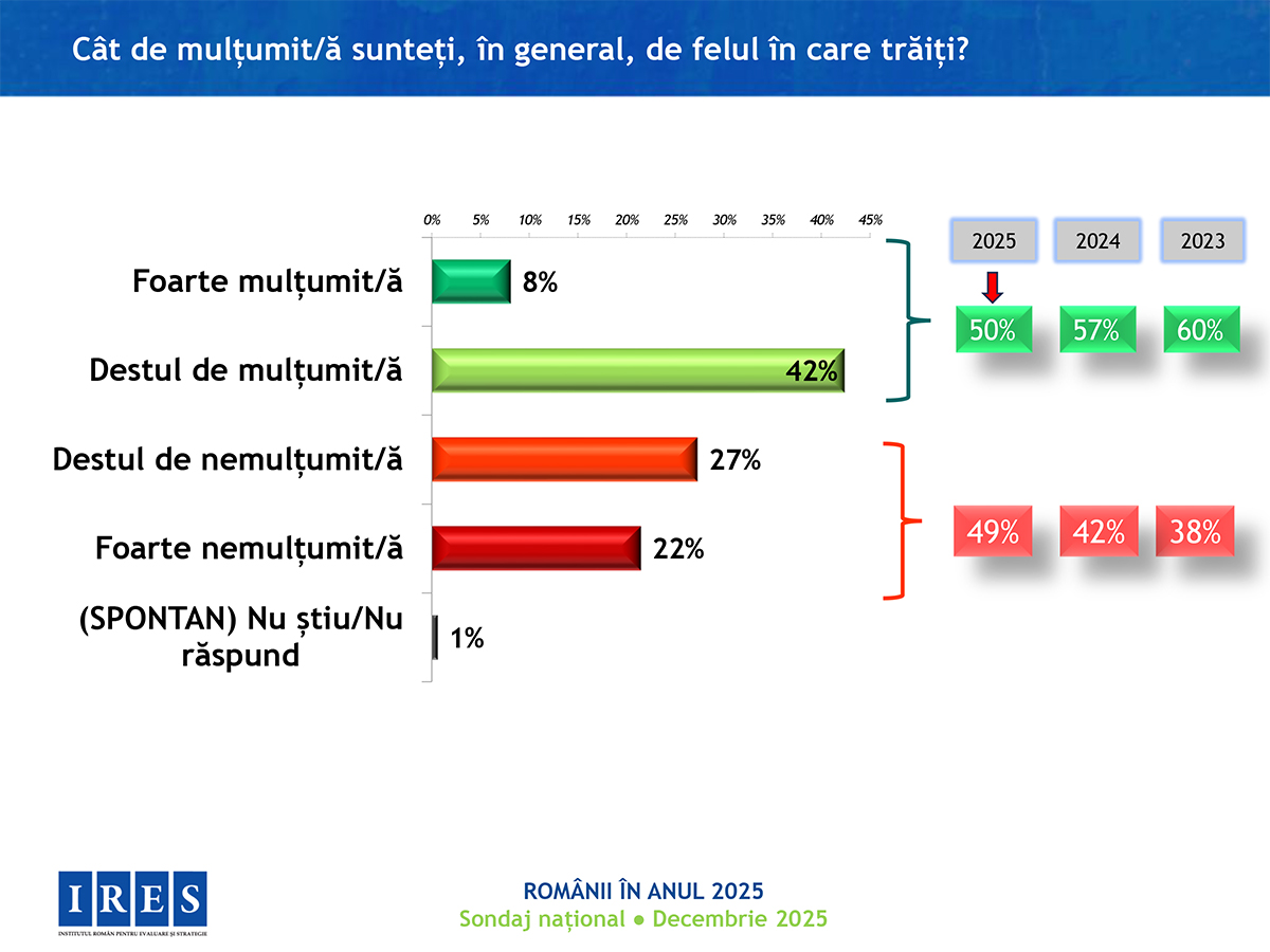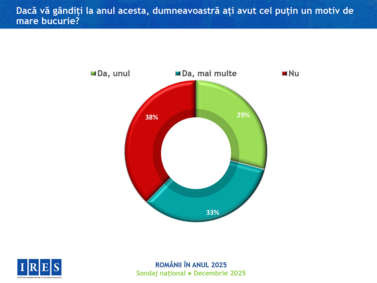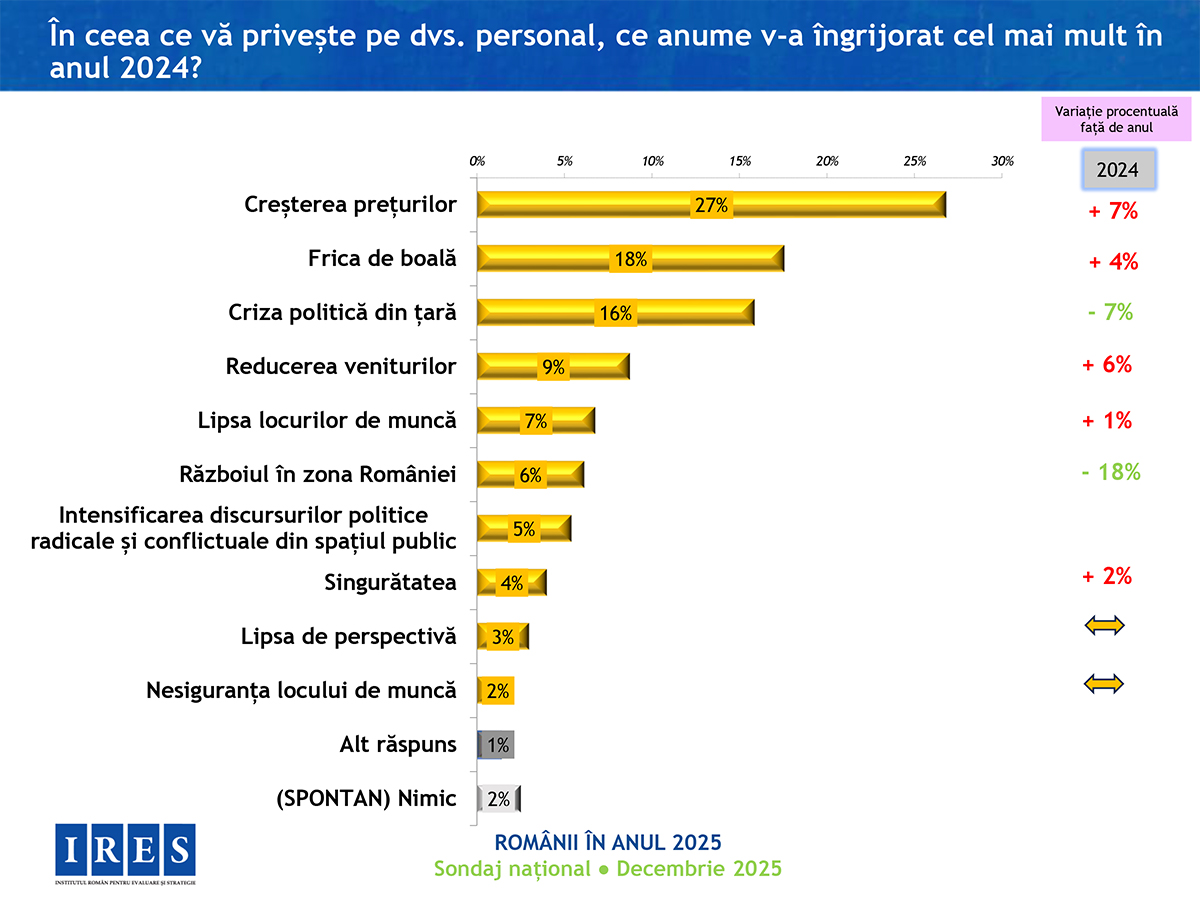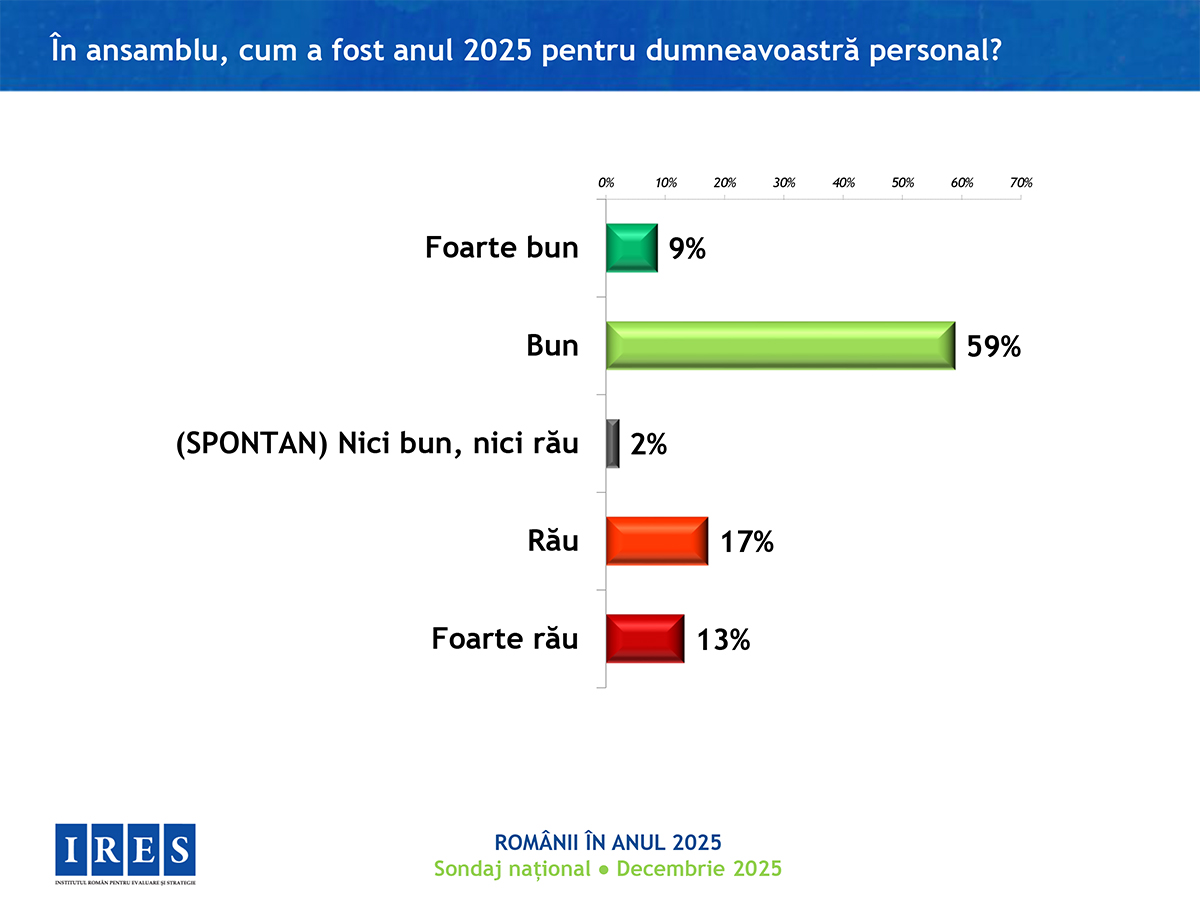 În anul care se încheie, românilor le-a fost cel mai frică de creșterea prețurilor, apoi de boli și criză politică, se arată într0un sondaj realizat de Institutul Român pentru Evaluare și Strategie (IRES). 42% dintre persoanele chestionate se declară „destul de mulțumite” de felul în care trăiesc, iar în ansamblu, anul 2025 a fost unul bun (59%). Totuși, 67% dintre respondenți spun că nu au avut nicio reușită, nici personal și nici pe plan profesional.