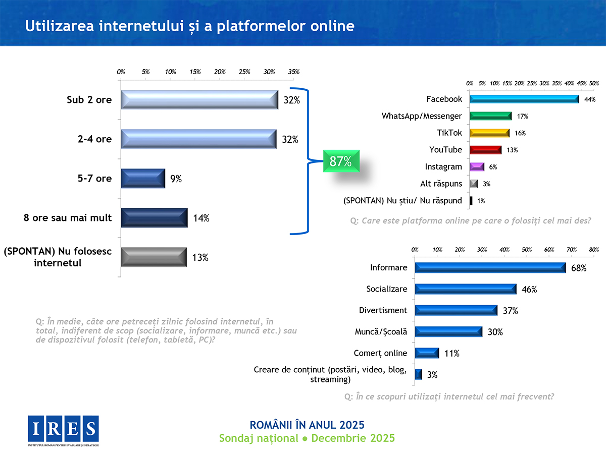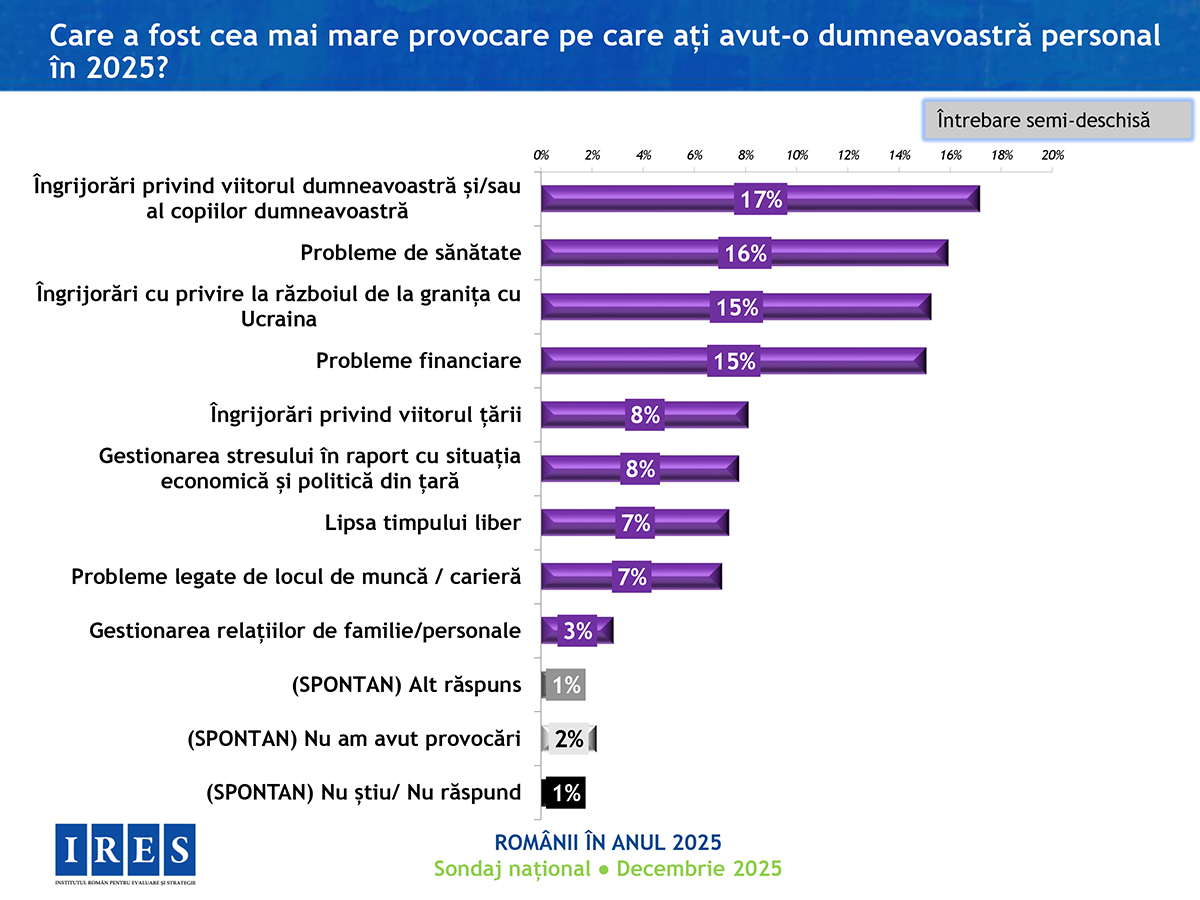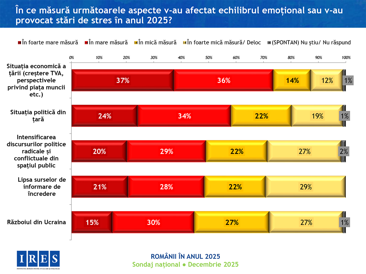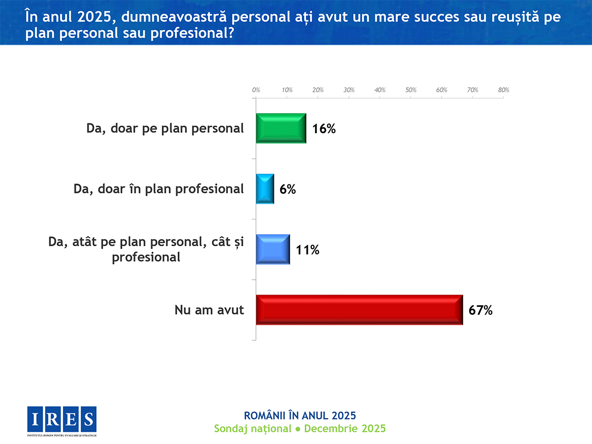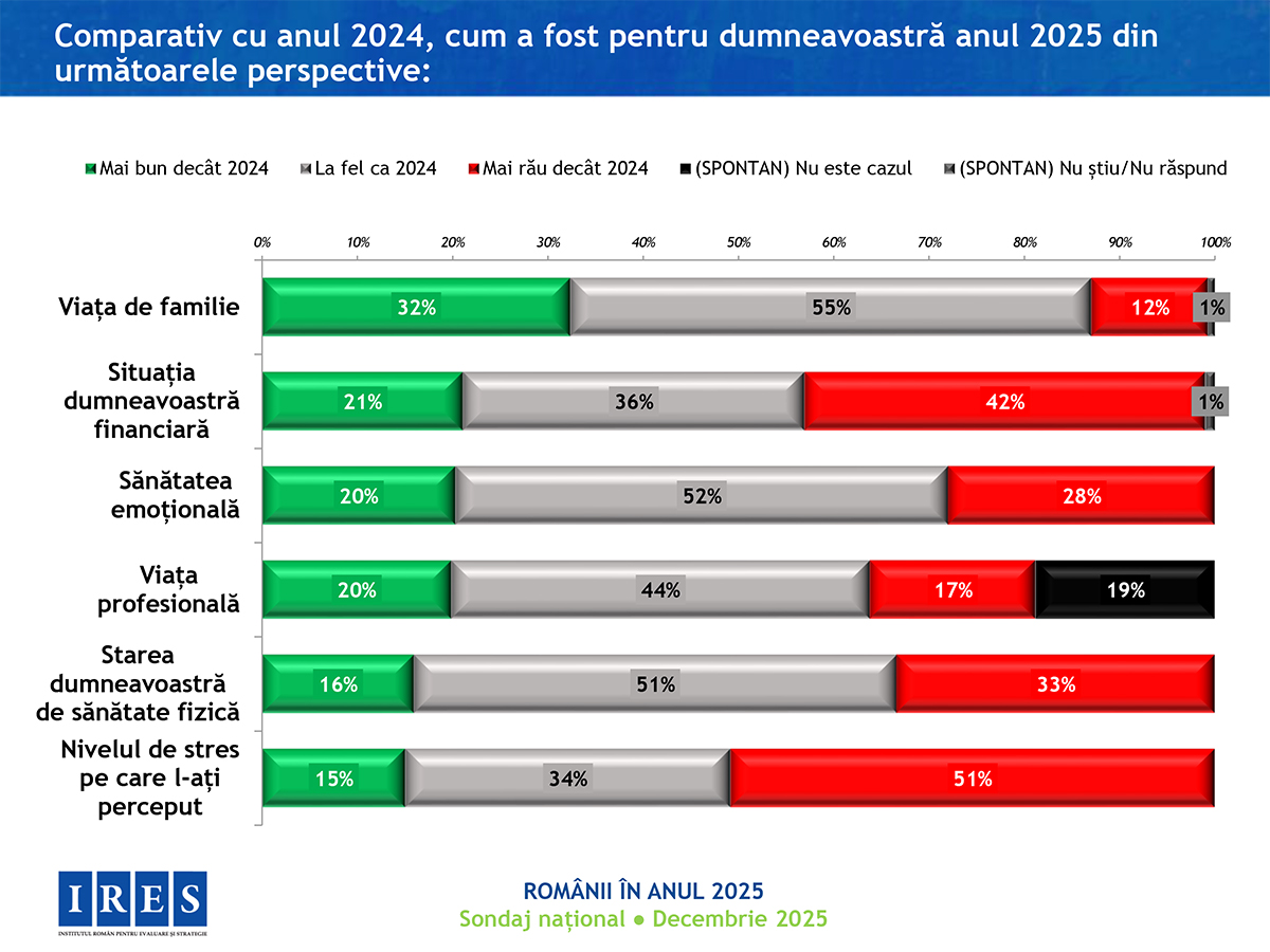 În anul care se încheie, românilor le-a fost cel mai frică de creșterea prețurilor, apoi de boli și criză politică, se arată într0un sondaj realizat de Institutul Român pentru Evaluare și Strategie (IRES). 42% dintre persoanele chestionate se declară „destul de mulțumite” de felul în care trăiesc, iar în ansamblu, anul 2025 a fost unul bun (59%). Totuși, 67% dintre respondenți spun că nu au avut nicio reușită, nici personal și nici pe plan profesional.