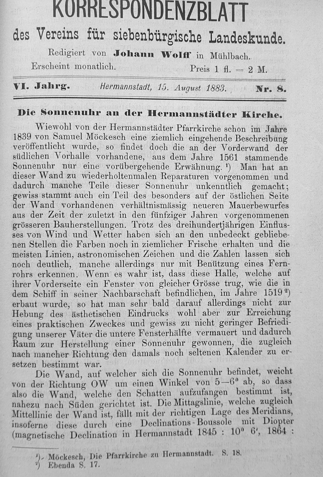Deși despre biserica parohială din Hermannstadt a fost publicată încă din anul 1839 de către Samuel Möckesch o descriere destul de detaliată, cadranul solar aflat pe peretele frontal al pridvorului sudic, datând din anul 1561, este menționat doar în treacăt¹). Pe acest perete s-au efectuat de mai multe ori reparații, iar prin acestea unele părți ale cadranului solar au devenit de nerecunoscut; cu siguranță o parte din tencuiala relativ mai nouă de pe latura estică a peretelui provine din perioada ultimelor lucrări mai ample de restaurare, efectuate în anii cincizeci.