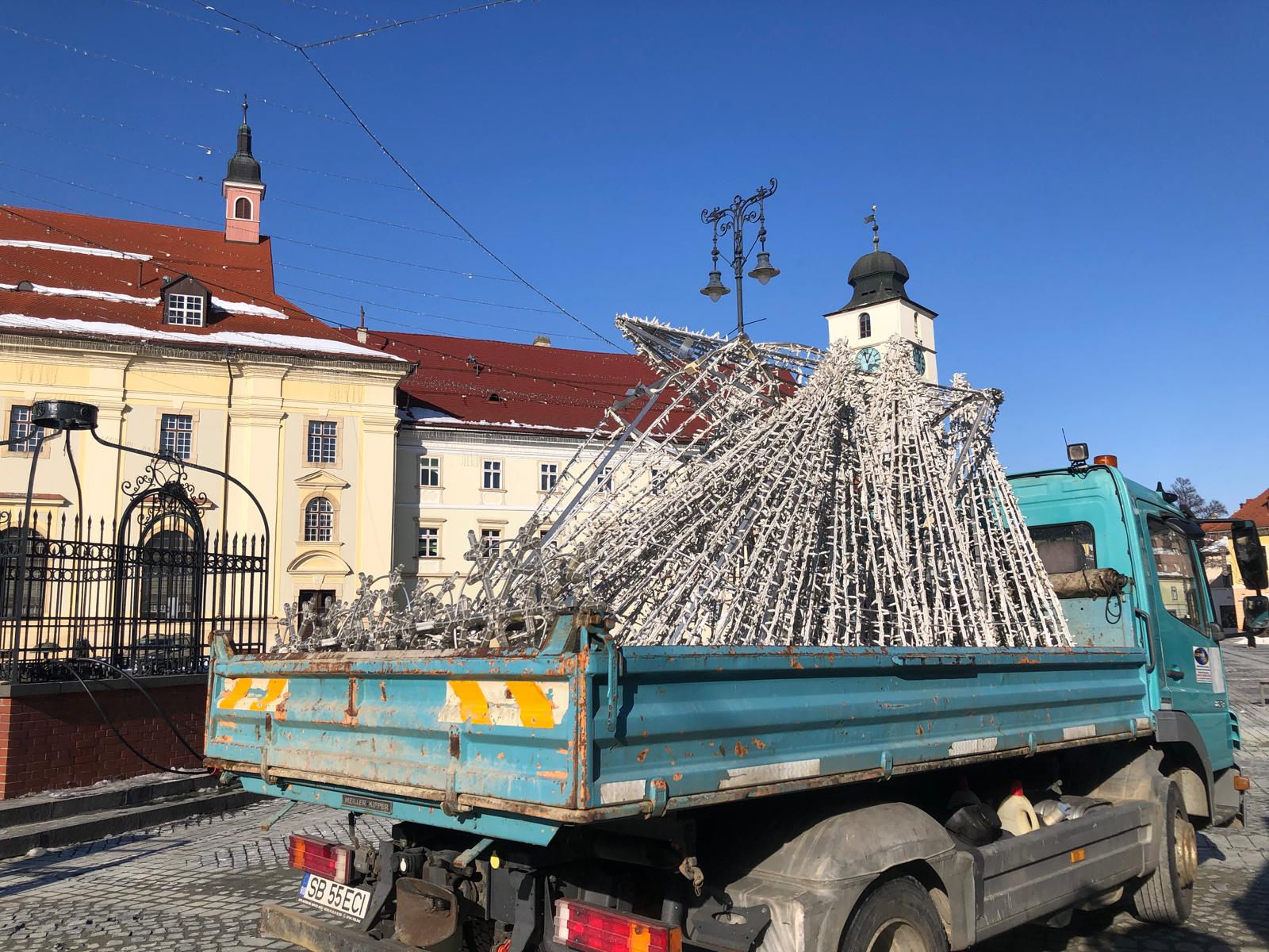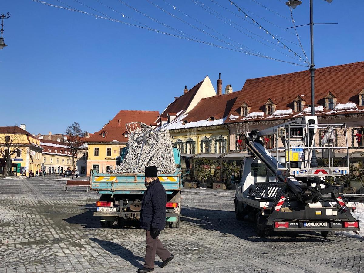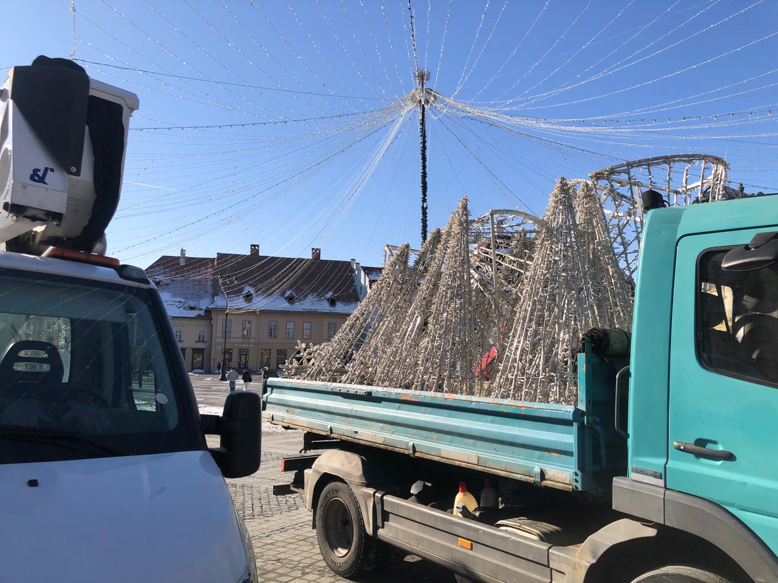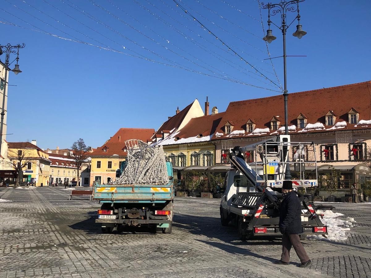 La primele ore ale zilei de luni mașinile încărcau decorațiunile care au înfrumusețat Sibiul de-a lungul sărbătorilor de iarnă. Bradul și cupola de lumini urmează și ele să fie strânse zilele viitoare.