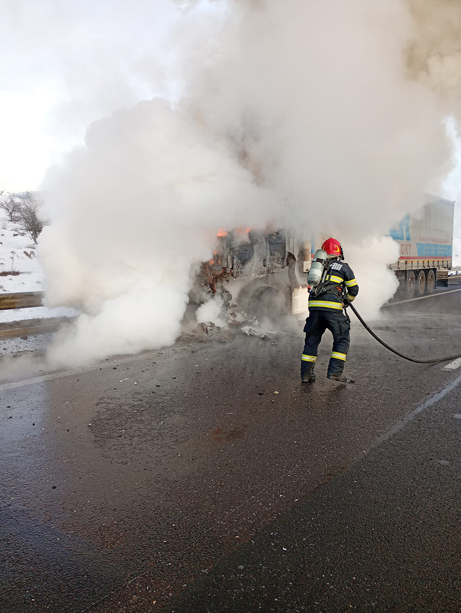 Pompierii sibieni au intervenit miercuri pentru stingerea unui incendiu izbucnit la capul tractor al unui TIR. Nu au fost victime.