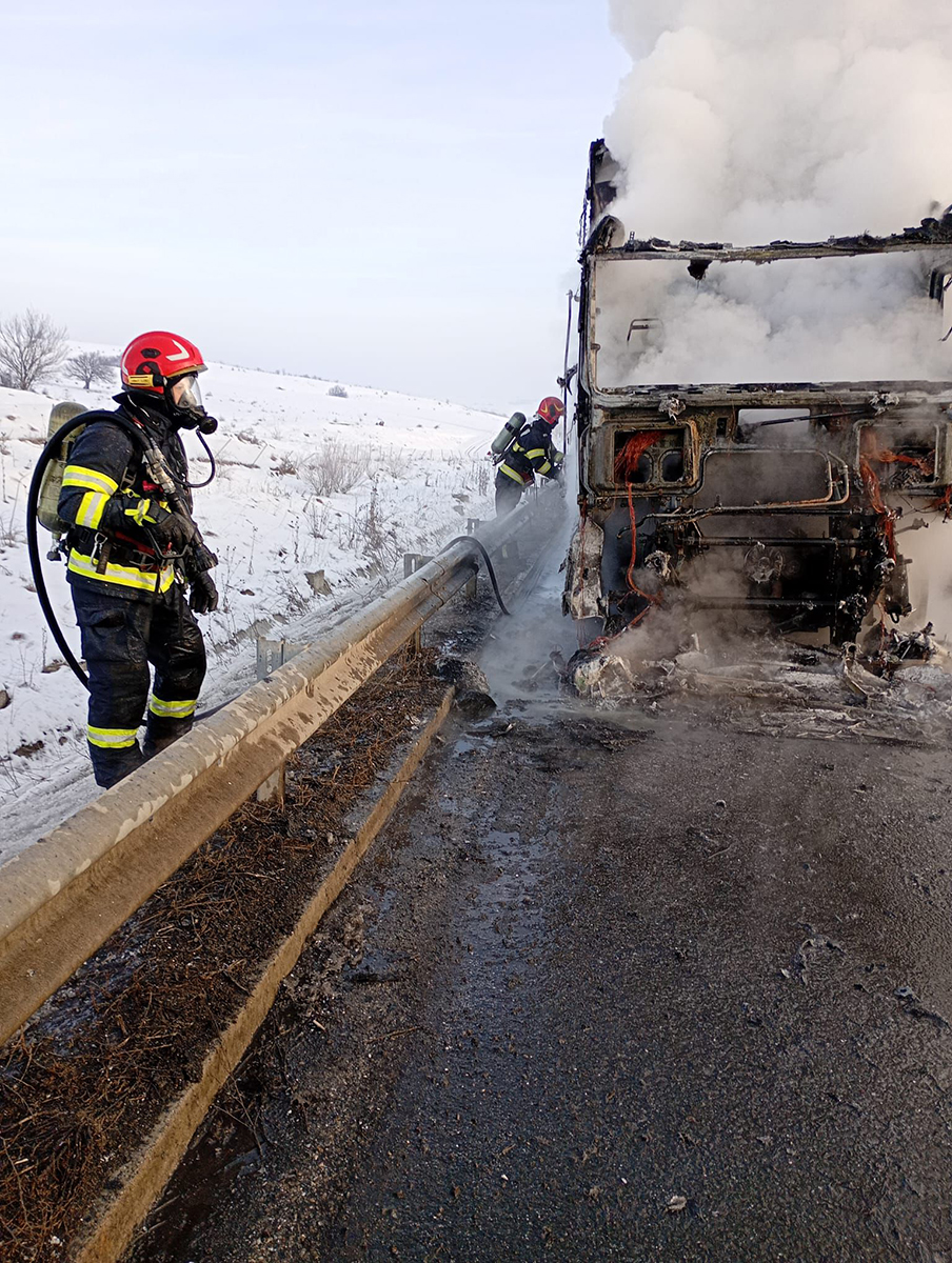 La sosirea pompierilor incendiul se manifesta generalizat la capul tractor, fiind extins si la remorcă. În aceste momente se acționează pentru stingerea incendiului, spune slt. Andreea Ștefan, purtător de cuvânt al Inspectoratului pentru Situații de Urgență (ISU) Sibiu.
