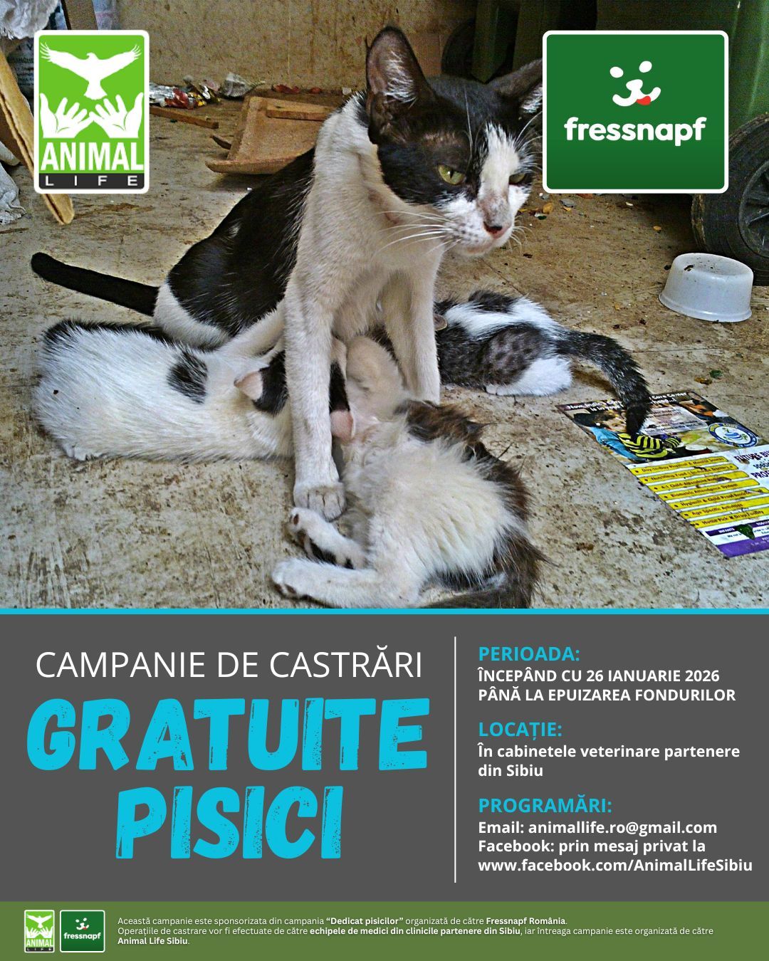 „Începând cu 26 Ianuarie 2026, desfășurăm o campanie de sterilizări gratuite pentru pisici în limita fondurilor disponibile. Sterilizările vor avea loc în cabinetele veterinare partenere din municipiul Sibiu, pe bază de programare prealabilă, realizată prinemail la: [email protected] sau prin mesaj privat trimis pe pagina de Facebook: Animal Life Sibiu”, arată asociația.