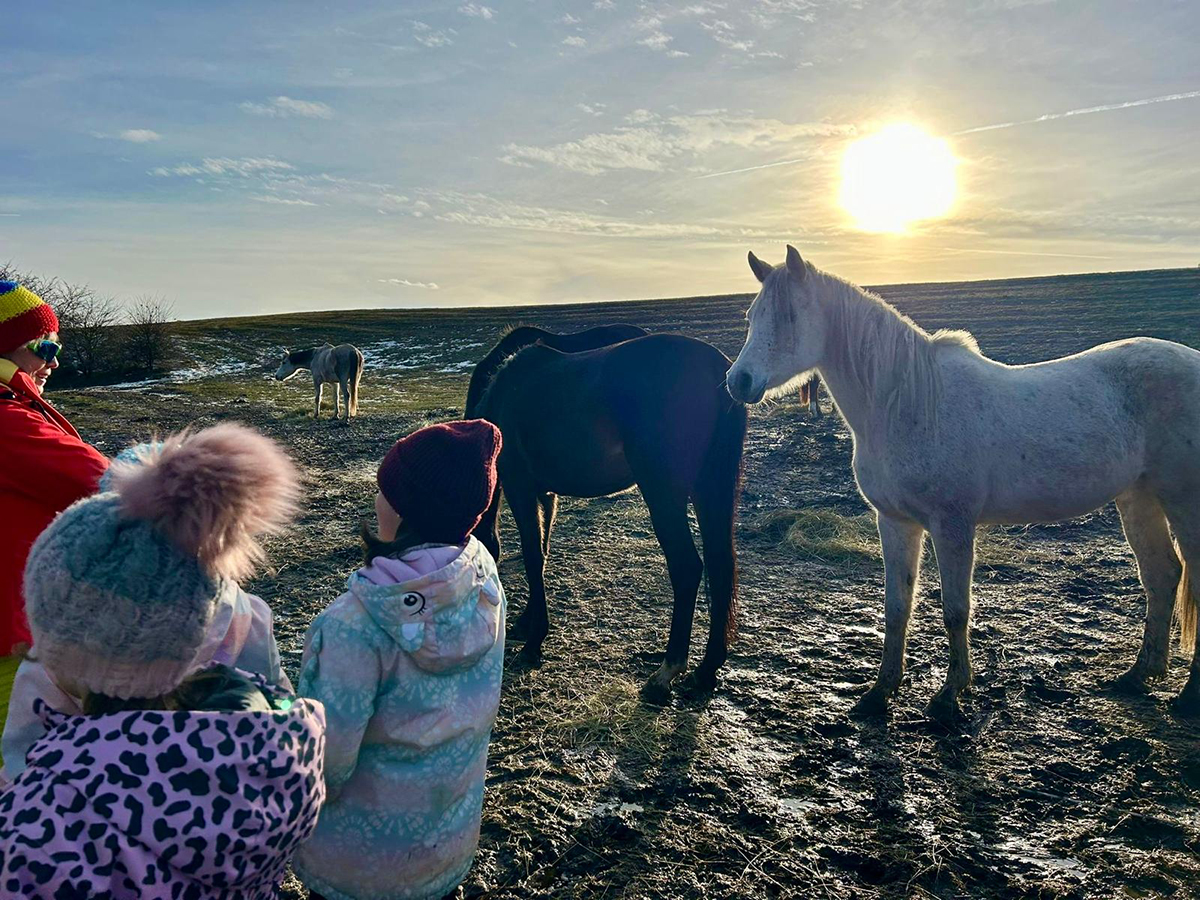 După horă, drumeții au ajuns la herghelia „Raiul Cailor”, unde au admirat câteva exemplare superbe de cai arabi și au savurat o porție zdravănă de gulaș cu mămăliguță.