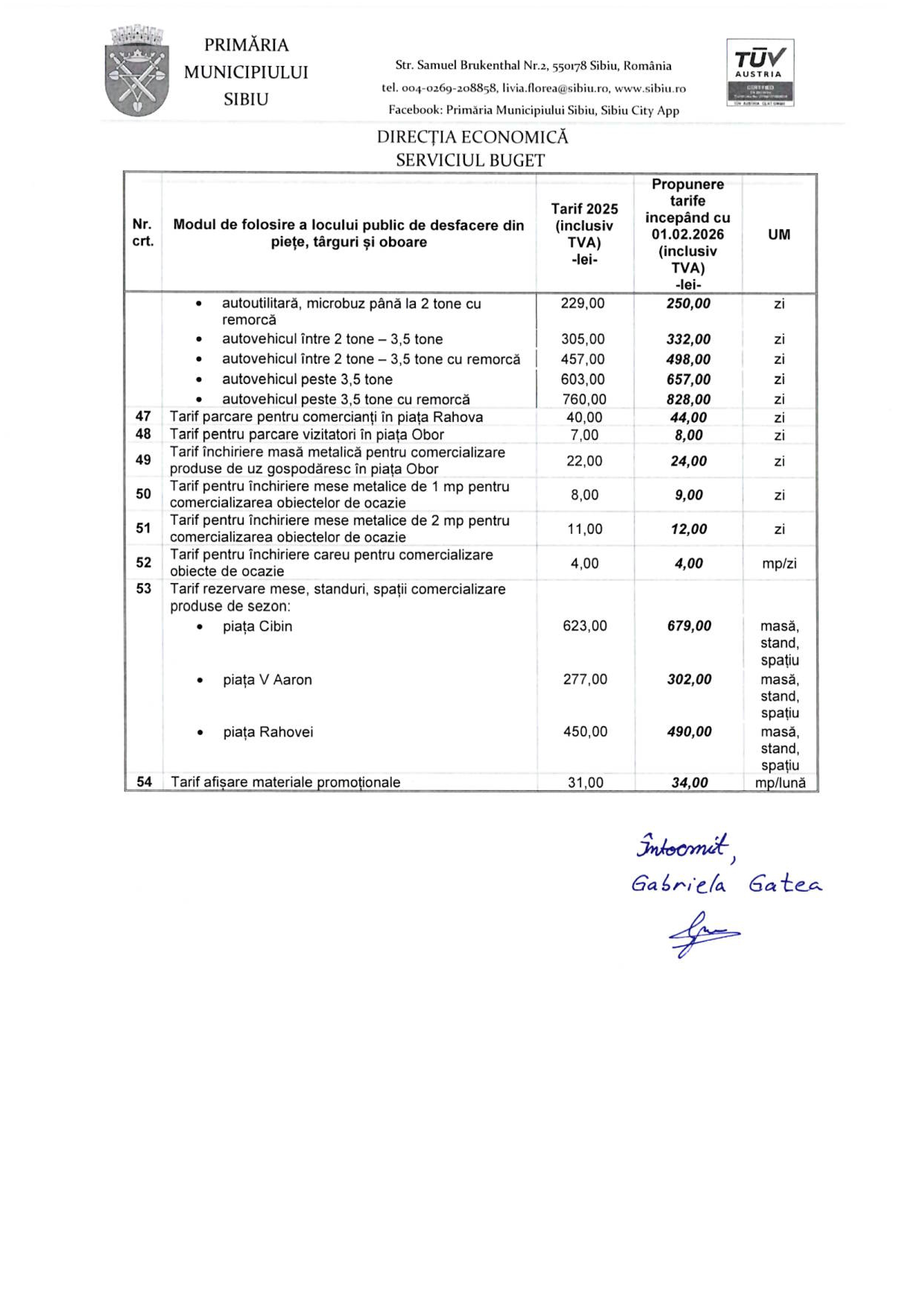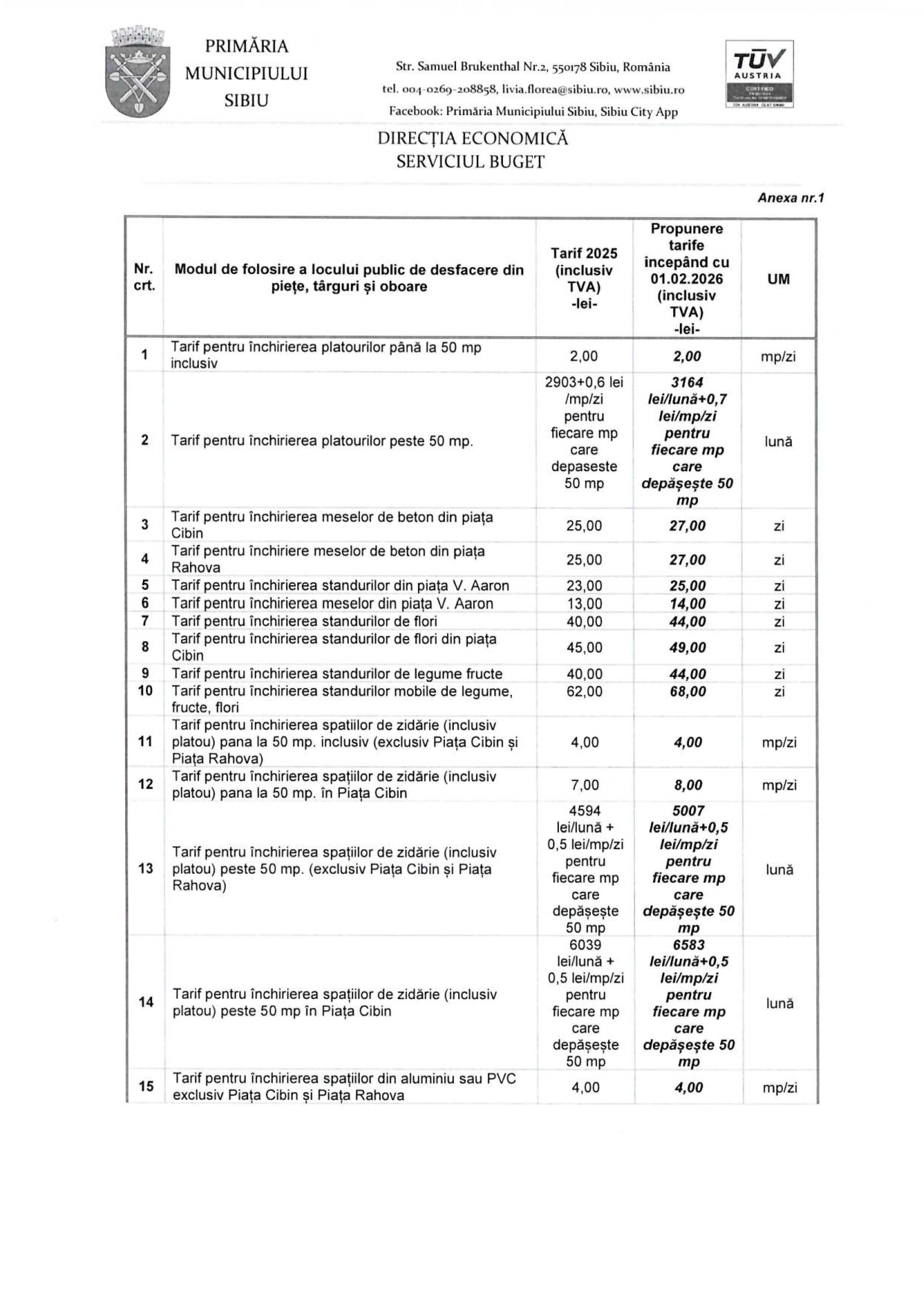 De exemplu, tariful pentru închirierea meselor de beton atât din Piața Cibin, cât și din Piața Rahova, ar urma să crească de la 25 lei pe zi la 27 lei pe zi. De asemenea, tariful zilnic pentru închirierea standurilor de flori din Piața Cibin se va majora de la 45 lei la 49 lei, iar cel pentru închirierea boxelor pentru produse din carne în Piața Cibin, Piața Rahova și Piața V. Aaron va urca de la 109 lei la 119 lei pe zi.