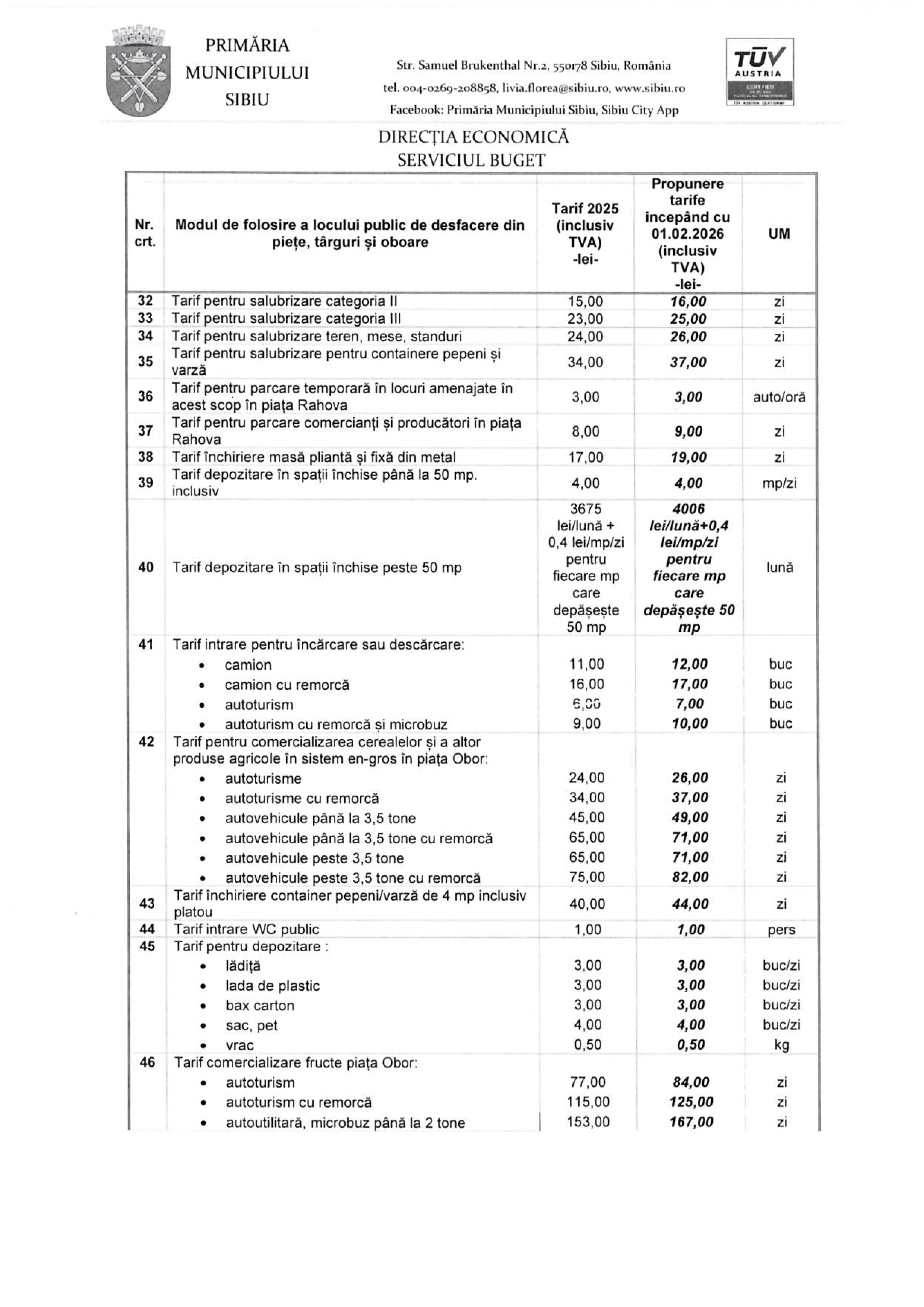 La fel este și pentru închirierea spațiilor de zidărie de peste 50 mp, unde se propun tarife cu 500 de lei mai mari: de la 4.594 lei/lună + 50 bani/mp/zi pentru fiecare mp care depășește 50 mp în prezent la 5.007 lei/lună + 50 bani/mp/zi pentru fiecare mp care depășește 50. În piața Cibin acest tarif va fi de 6.583 lei/lună față de 6.039 lei în prezent, la care se adaugă 50 de bani/mp/zi.