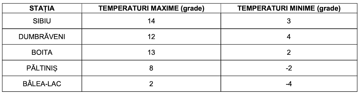 Temperaturile maxime prognozate pentru ziua de vineri indică 14 grade în municipiul Sibiu, 2 la Bâlea-Lac și 8 la Păltiniș. „Cerul va fi variabil, temporar noros. Pe arii restrânse se vor semnala ploi, în special în cursul serii și al nopții, când trecător vor fi condiții de polei. La munte vor fi precipitații mixte. Vântul va sufla slab și moderat, cu unele intensificări locale în zonele montane. Temperaturile maxime se vor încadra între 12 și 14 grade, iar cele minime între 2 și 4 grade. Izolat se va semnala ceață”, se arată în prognoza semnată de meteorologul Florin Gheorghe Bugner.