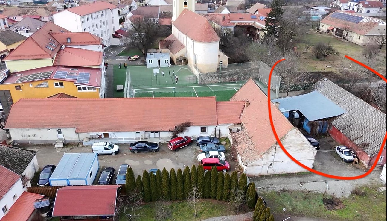 Pe un teren împărțit pe jumătate cu Primăria Șelimbăr (vezi foto sus), atelierul auto funcționează într-o clădire cu destinația grajd (foto jos). Sursa imaginilor: captură extrase CF