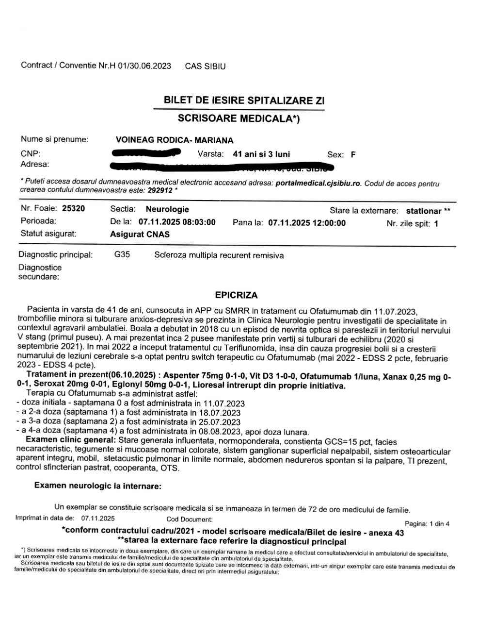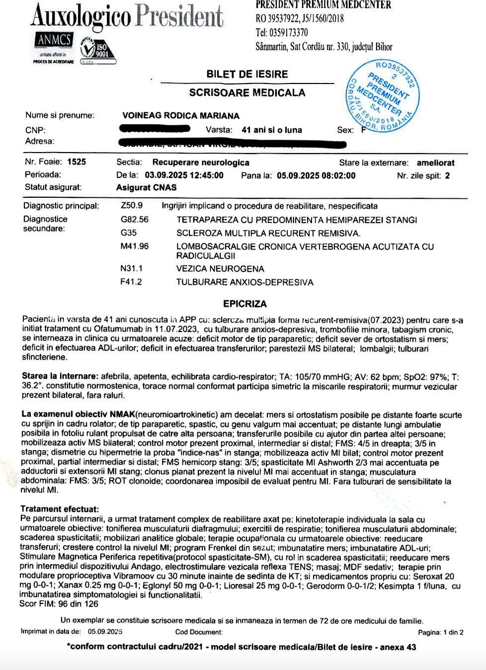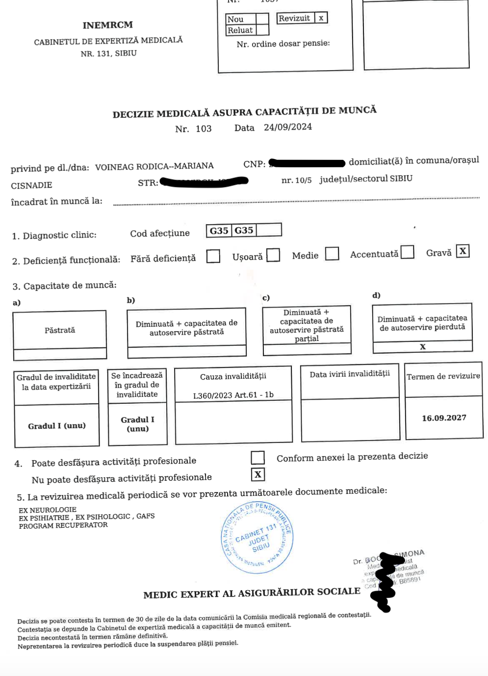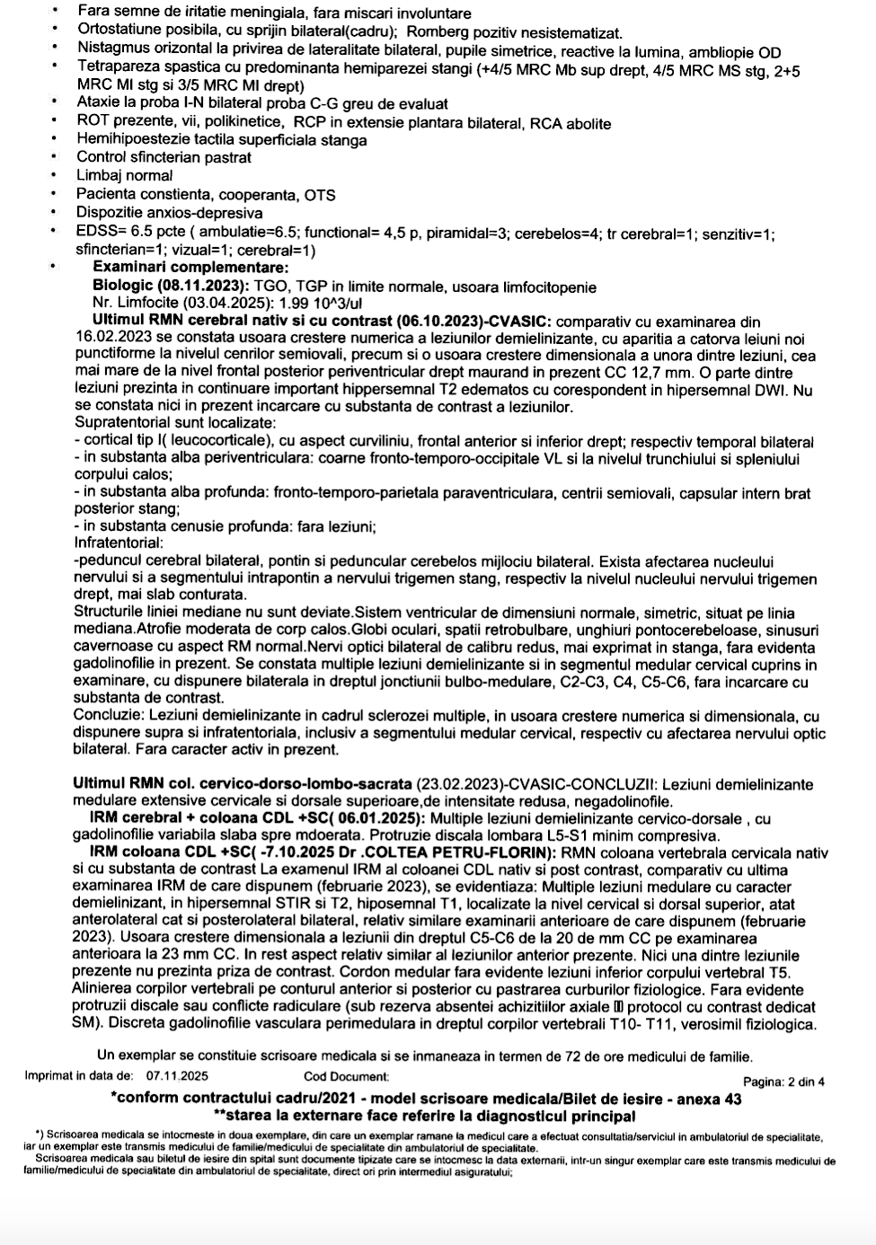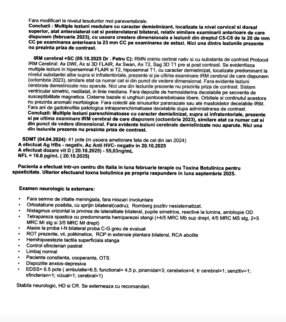 Astăzi, boala este considerată stabilă. Ultimele investigații RMN arată că nu au apărut leziuni sau inflamații noi. Este o veste bună, dar nu suficientă. Fără recuperare intensivă, corpul rămâne blocat. Lipsa mișcării a dus la spasticitate, momente în care mușchii se încordează și nu mai poate controla mișcarea. Se confruntă și cu episoade de amețeală și cu o formă de anemie. Fără sprijin, nu se poate deplasa.