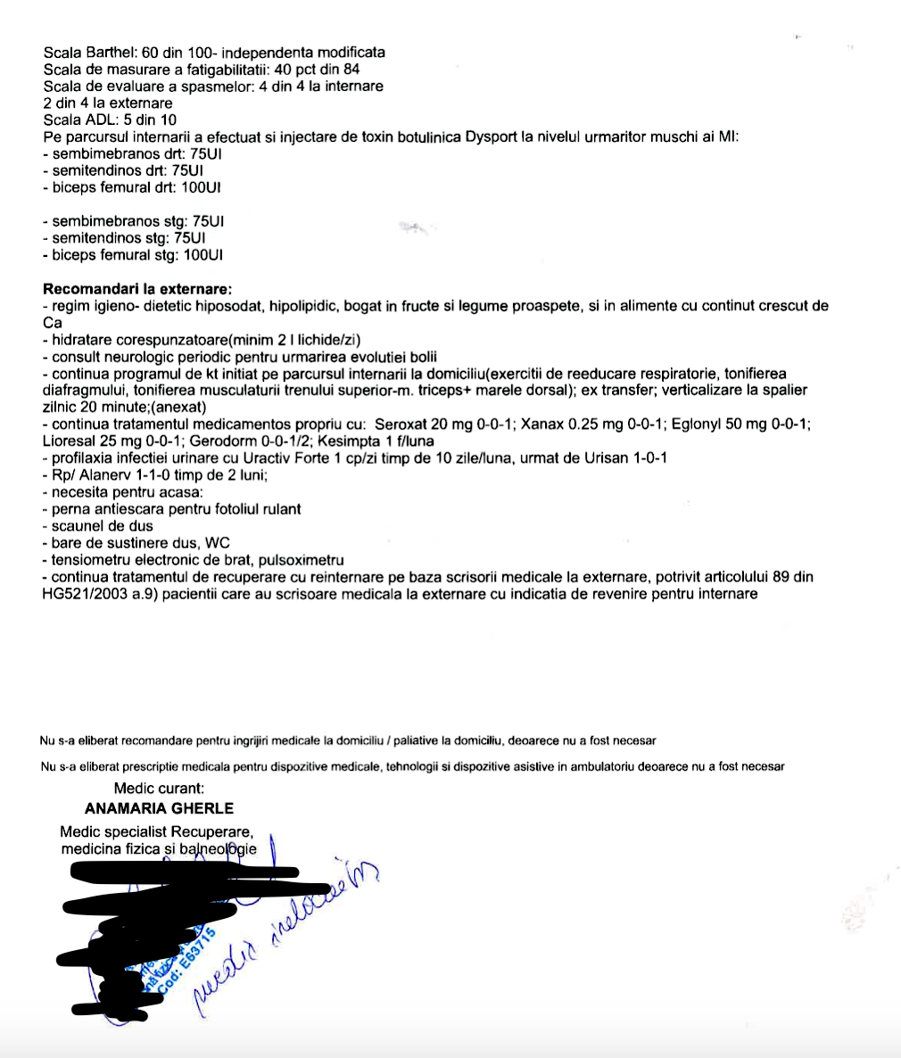 Medicii i-au recomandat un program complex de kinetoterapie, masaj și recuperare medicală robotizată, desfășurat timp de cel puțin un an.