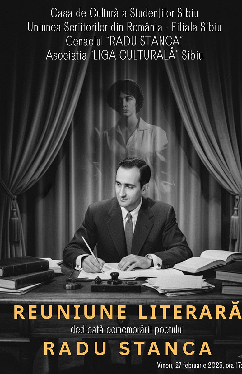Casa de Cultură a Studenților Sibiu, Uniunea Scriitorilor din România – Filiala Sibiu, Cenaclul „Radu Stanca” Sibiu și Asociația „Liga Culturală Sibiu” invită publicul sibian la o reuniune literară dedicată comemorării poetului Radu Stanca, una dintre personalitățile marcante ale culturii române.
