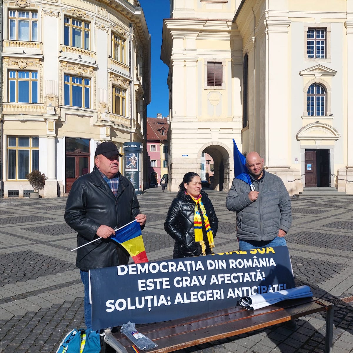 Un protest față de măsurile de austeritate ale Guvernului României a început joi dimineață în Piața Mare din Sibiu, după ce Comisia de avizare a adunărilor publice din cadrul Primăriei Sibiu a aprobat desfășurarea manifestației pentru două zile. La debut au participat doar organizatorul, iar ulterior acestuia i s-a alăturat soția și alte câteva persoane.