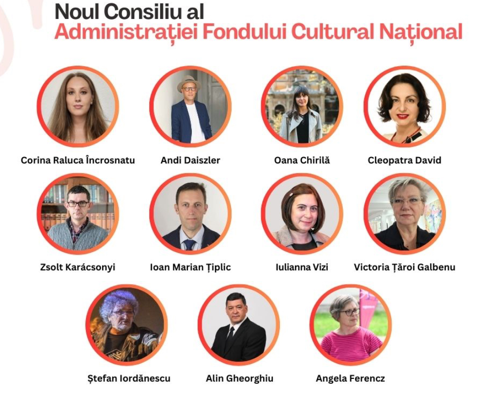Ministerul Culturii a anunțat la începutul acestei săptămâni noul Consiliu al Administrației Fondului Cultural Național (AFCN), care va fi alcătuit din: Oana Chirilă, Andi Daiszler, Cleopatra David, Angela Ferencz, Alin Gheorghiu, Corina Raluca Încrosnatu, Ștefan Iordănescu, Zsolt Karacsonyi, Ioan Marian Tiplic, Victoria Țăroi Galbenu, Iulianna Magda Vizi. Aceștia vor avea un mandat de 2 ani.