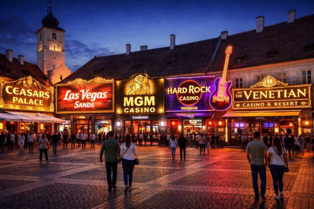 Medicul de familie Egru Eduard, un nume cunoscut publicului sibian, a realizat cu ajutorul platformelor de inteligență artificială o imagine care simulează Piața Mare a Sibiului împânzită cu săli de jocuri de noroc.