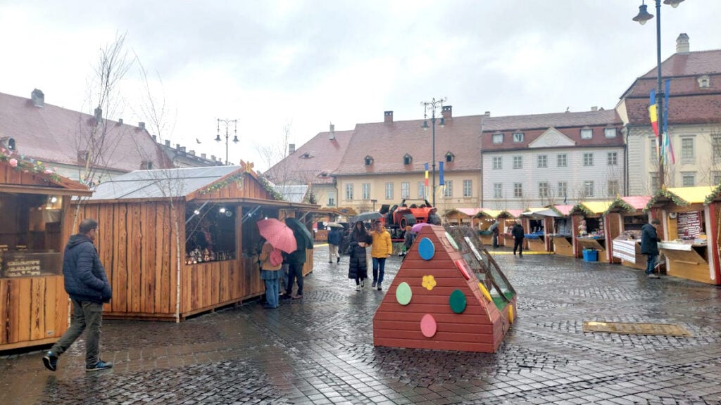 La ora 11.00 încă plouă, dar multe dintre căsuțele târgului au deschis deja. Doar pe ici pe colo mai este câte un comerciant care nu a reușit încă să aranjeze totul ca la carte. Mai au încă timp. Cel mai probabil din a doua parte a zilei vor începe vizitatorii să umple spațiul în adevăratul sens al cuvântului. Deocamdată, curioșii care se plimbă prin ploaia sunt elevii aflați în Săptămâna Verde, turiștii străini și câțiva sibieni. Am auzit vorbindu-se în spaniolă și în germană în jurul meu. O parte dintre turiști provin dintr-un tur organizat și ghidat.