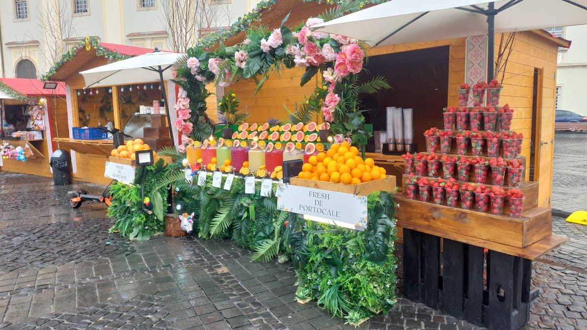 Foarte atrăgător arată și căsuța de sucuri fresh. Cu un design făcut din fructe naturale este afacerea unor comercianți care au venit tocmai din Iași. De doi ani se ocupă de astfel de sucuri.