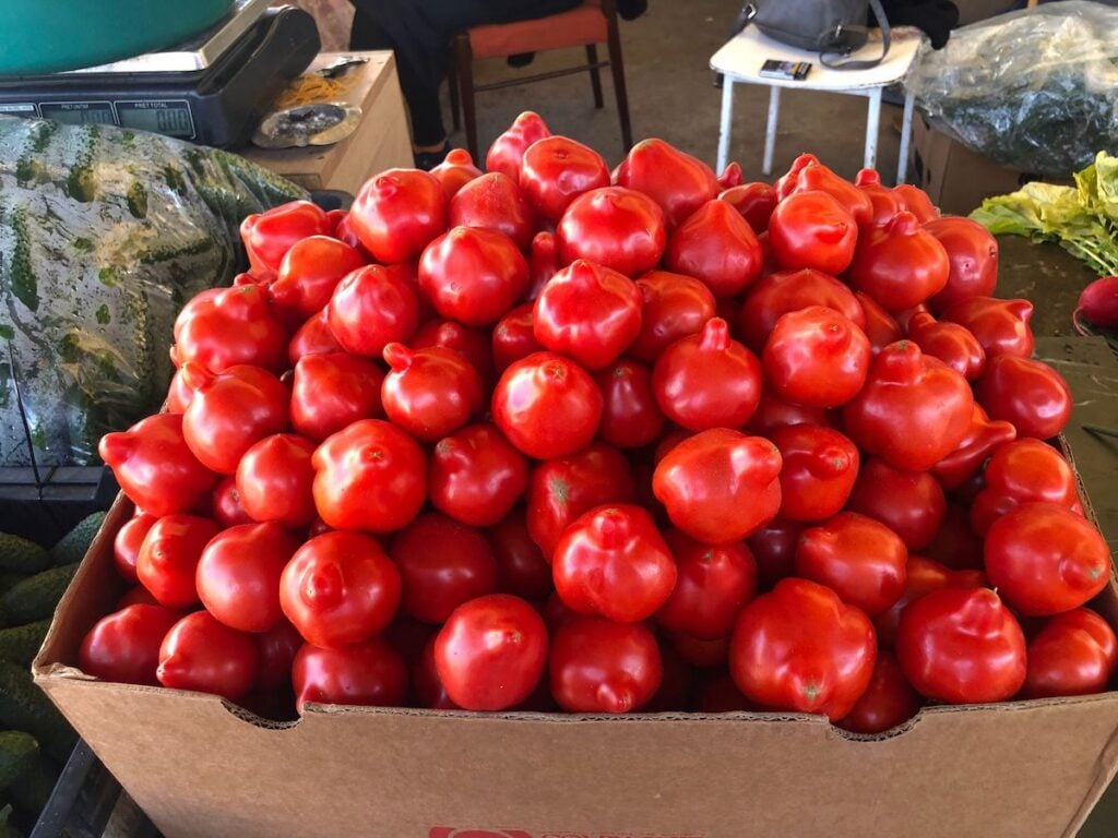 O singură producătoare are de vânzare roșii românești. Este din Izbiceni, județul Olt, și spune că a adus doar 10-12 kilograme ca să vadă cum va merge vânzarea.