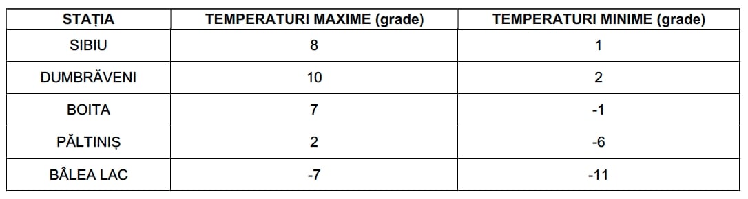 Cel mult 8 grade se anunță la Sibiu în cursul zilei de miercuri, în timp ce în nordul județului temperaturile maxime vor urca până la 10 grade. „Vremea va continua să se răcească, devenind rece pentru această perioadă. Cerul va fi mai mult noros. Pe arii restrânse se vor semnala precipitații predominant sub formă de ploaie, iar la munte vor predomina ninsorile și se va depune strat nou de zăpadă. Vântul va sufla în general moderat, cu intensificări locale, cu viteze de 50-70 km/h”, se arată prognoza semnată de meteorologul Florin-Gheorghe Bugner.