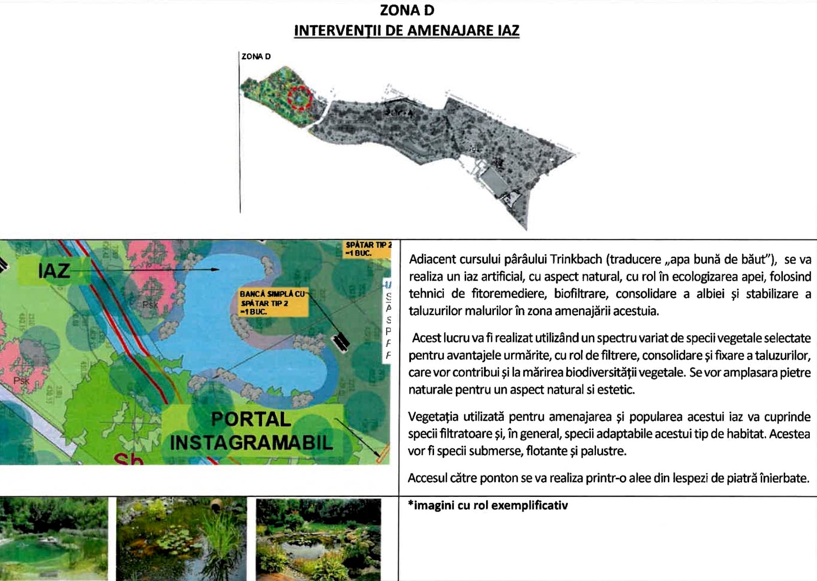 „În proximitatea iazului, se propune amenajarea unui portal decorativ instagramabil, gândit ca un punct de atracție vizuală, de relaxare şi social media-friendly. Acesta este amplasat strategic pentru a încadra perspectiva asupra apei și a vegetației din jur, creând un fundal natural spectaculos pentru fotografii”, se mai arată în documentația licitației.