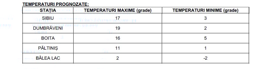 Temperaturile maxime se vor încadra între 16 și 19 grade, iar cele minime între 2 și 5 grade. Izolat vor fi condiții de ceață.