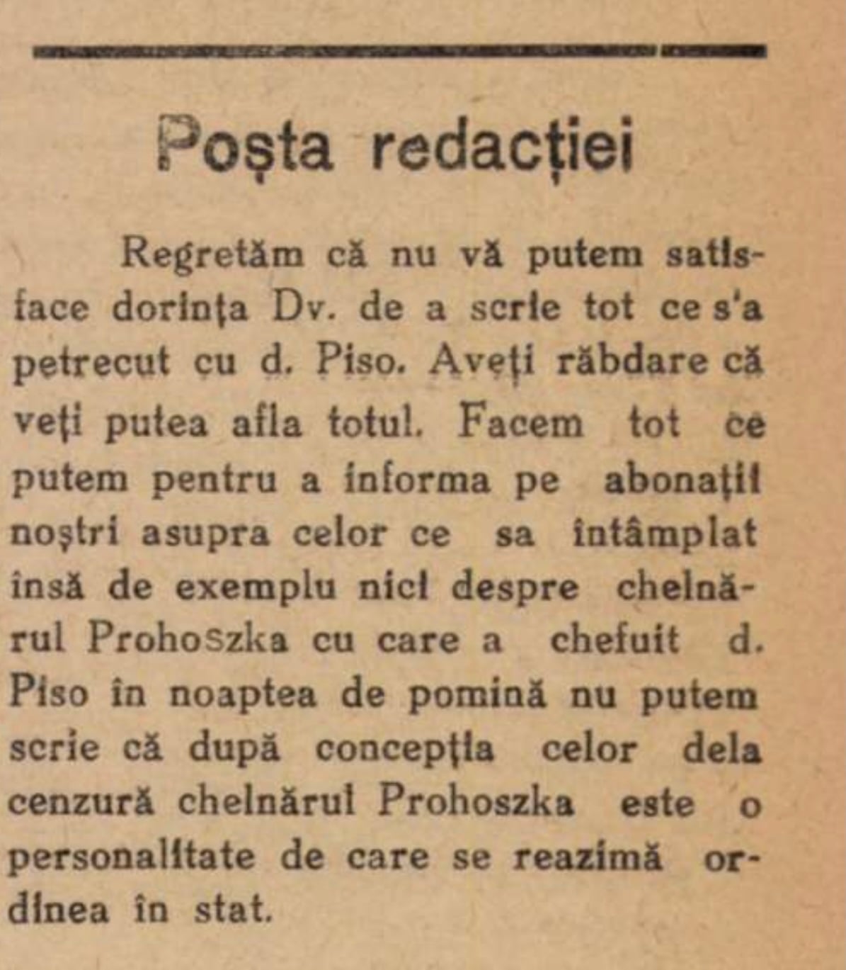 Domnul Piso, în schimb, a decis să continue cheful la Restaurantul Hotelului Bulevard din centrul orașului.