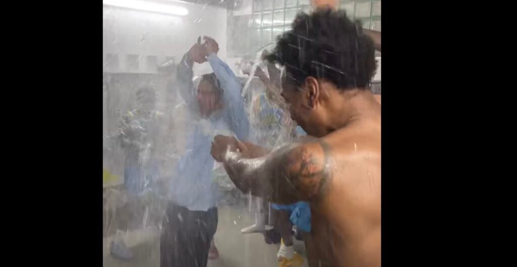 Baschetbaliștii sibieni l-au udat din cap până în picioare cu mai multe sticle de apă pe antrenorul principal al echipei, Dan Fleșeriu, care s-a lăsat prins în bucuria jucătorilor.