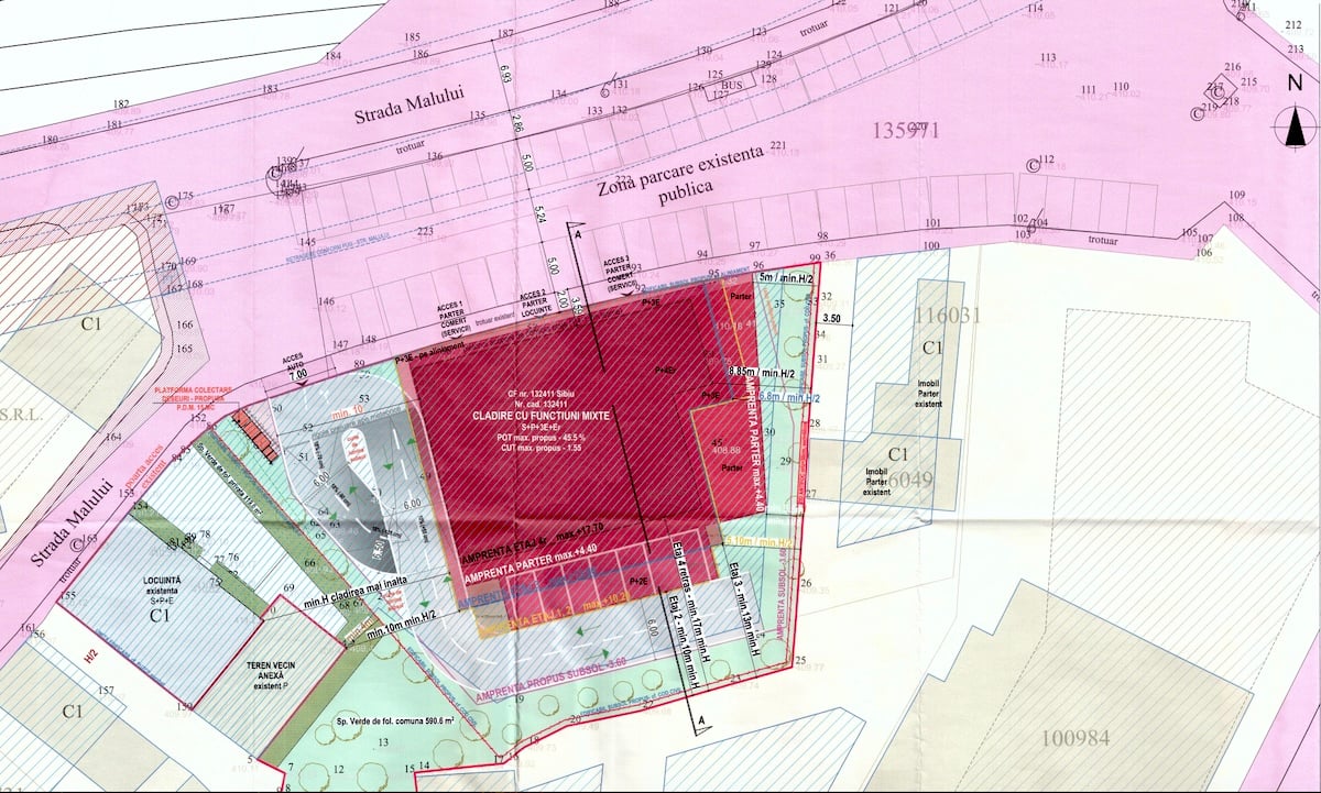 ”Accesul auto și pietonal pe terenul generator PUD se propune din Str. Malului. Va fi amenajată o parcare subterană la subsolul imobilului, cu capacitatea de minim 38 locuri de parcare. Va fi amenajată o parcare supraterană la nivelul solului, cu capacitatea de maxim 7 locuri de parcare”, precizează memoriul justificativ.