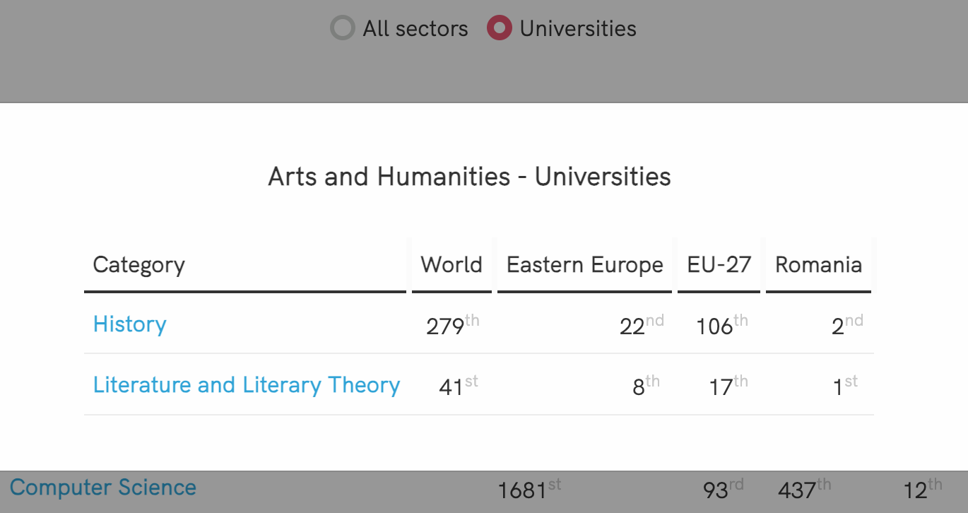 Ca și în anul precedent, în clasamentele pe domenii ULBS excelează la categoria Științe umaniste, unde domeniul Literatură și Teorie Literară ocupă locul 1 la nivel național și locul 8 în Europa de Est, iar Istoria locul 2 în România și 22 în Europa de Est. Domeniul Economie, Econometrie și Finanțe se situează pe locul 5 național, în creștere cu trei poziții față de 2025, în timp ce domeniul Managementul afacerilor și Contabilitate se situează pe locul 6 național. Tot pe locul 6 național se menține și domeniul Psihologie, în timp ce domeniul Științelor Sociale ocupă locul 5 în clasamentul național al acestui an”, se arată într-un comunicat al instituției.