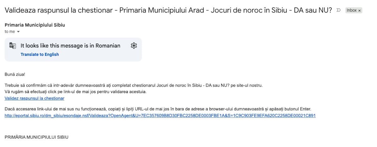 Deși este semnat Primăria Municipiului Sibiu, e-mailul de confirmare are în subiect Primăria Municipiului Arad.