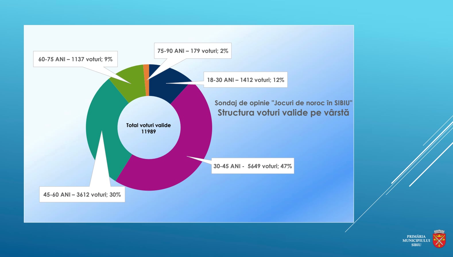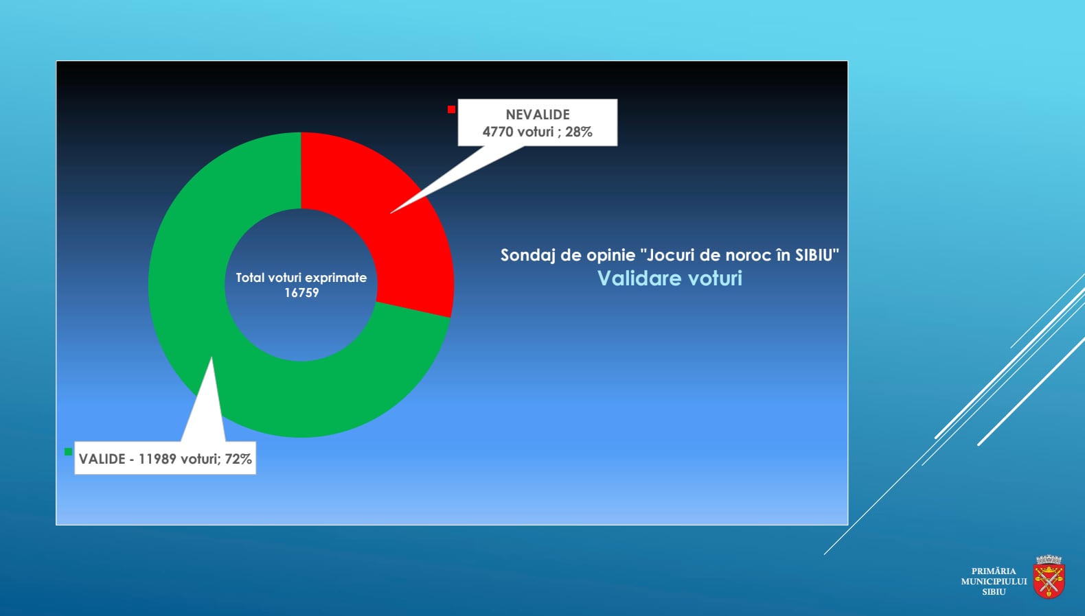 Din cele 11.989 validate, nu mai puțin de 11.346 de voturi sunt pentru interzicerea jocurilor de noroc în municipiul Sibiu. 643 de voturi au fost pentru o reglementare mai strictă a jocurilor de noroc.