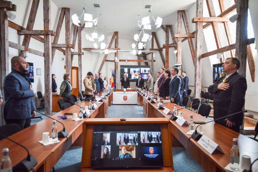 Din cei 21 de consilieri locali, în sala de ședințe din sediul Primăriei Sibiu au fost prezenți 15, alți cinci conectându-se on-line. A lipsit Laura Barac, reprezentantă a PSD.