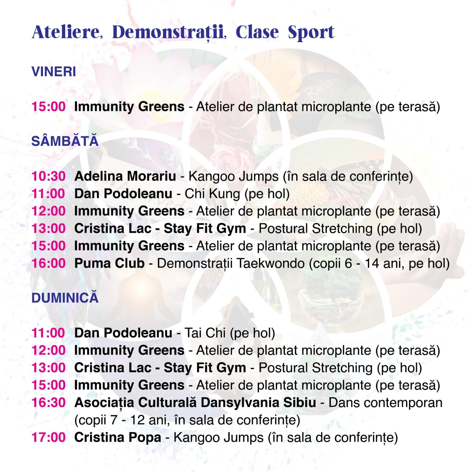 Pe lângă conferințe, participanții pot lua parte la activități sportive precum Kangoo Jumps, Tai Chi, Chi Kung, Pilates și Postural Stretching, dar și la demonstrații de Taekwondo pentru copii și momente de dans contemporan. Zona de ateliere include sesiuni de plantare de microplante, precum și activități de relaxare, meditații ghidate și băi de sunete.