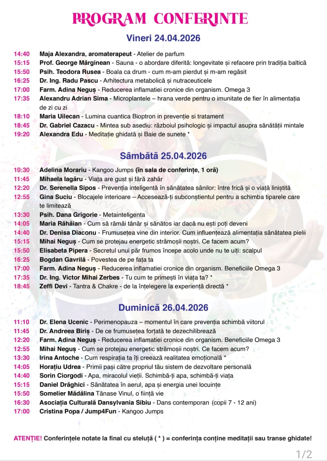 Programul cuprinde și o serie de conferințe susținute de medici, psihologi și farmaciști. Serenella Șipoș va aborda prevenția în sănătatea sânilor, Denisa Diaconu va vorbi despre relația dintre alimentație și sănătatea pielii, iar Elena Ucenic și Andreea Biriș vor susține prezentări legate de sănătatea feminină. De asemenea, farmacistul Adina Neguș va prezenta teme legate de inflamația cronică și beneficiile Omega 3, iar Gabriel Cazacu va aborda impactul stresului asupra sănătății mentale.