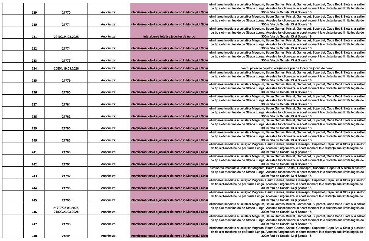 În cele 11 zile în care cele două proiecte au fost în consultare publică (12 – 23 martie 2026), pe adresa Primăriei Sibiu au fost transmise 989 de puncte de vedere. Din acestea, 763 sunt semnate de cetățeni care arată cer interzicerea desfășurării jocurilor de noroc pe raza municipiului Sibiu.