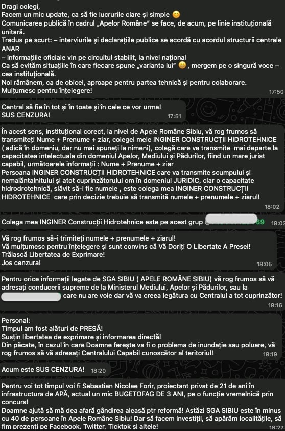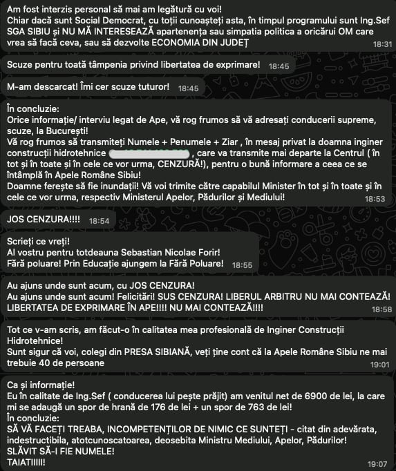 A început prin a scrie că informațiile din cadrul Apelor Române vor fi transmise, de acum încolo, „pe linie instituțională unitară”. A arătat că, fără acordul de la centru, el nu va mai putea transmite informații din domeniul său de activitate și care pot fi de interes pentru comunitatea sibiană. Iar eventualele solicitări de informații din partea presei sibiene trebuie transmise „conducerii supreme de la Ministerul Mediului, Apelor și Pădurilor sau la *** (un număr de telefon – n.r.) care nu are voie, dar vă va crea legătura cu Centralul atotcuprinzător”.