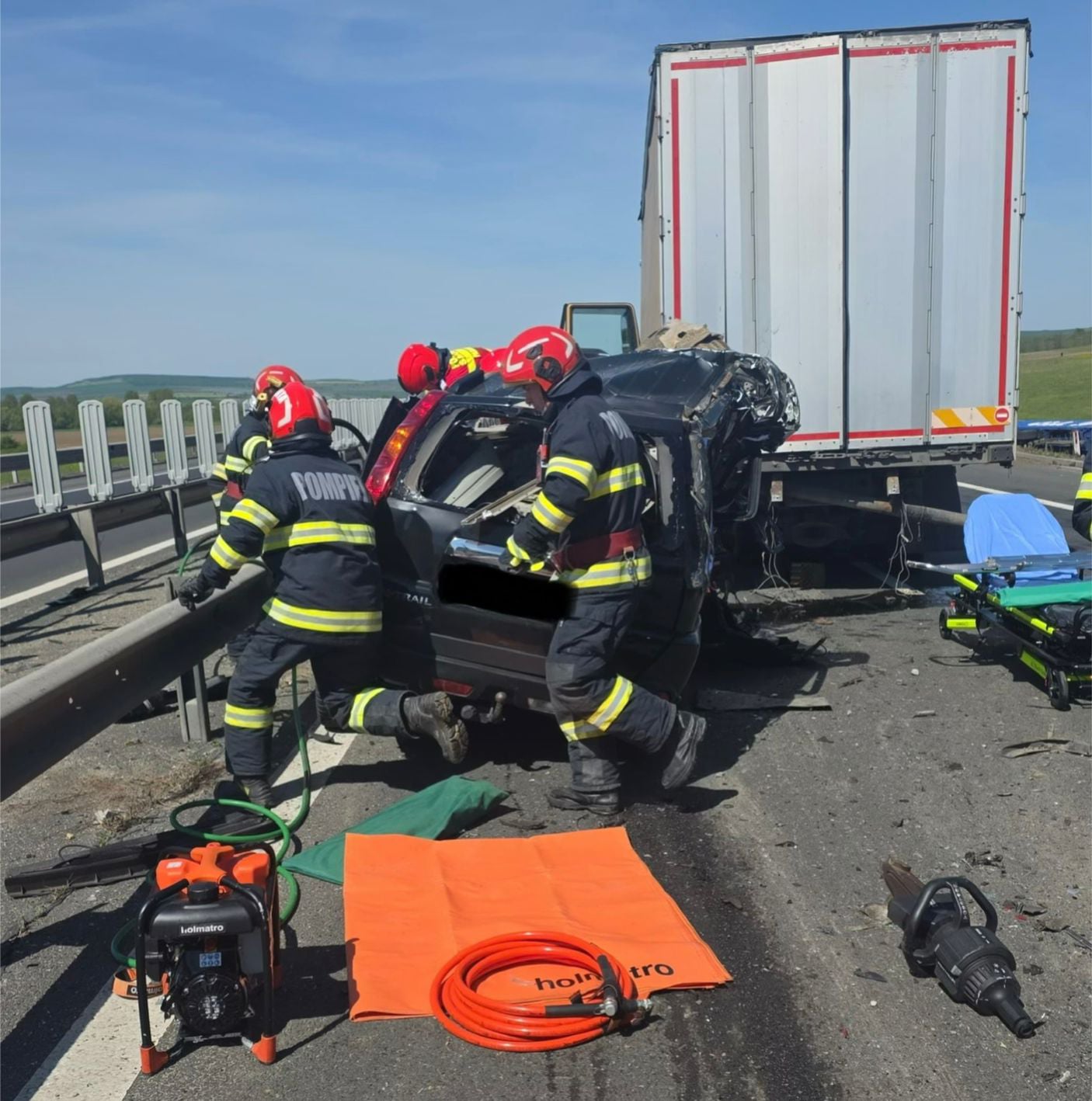 Salvatorii și polițiștii sibieni intervin la un accident petrecut marți pe A1, aproximativ la km 285, între localitățile Miercurea Sibiului și Apoldu de Jos, pe sensul de mers Sibiu – Alba. În accident au fost implicate un autoturism și două TIR-uri, unul dintre ele răsturnându-se de pe șosea. O persoană a avut nevoie de descarcerare.