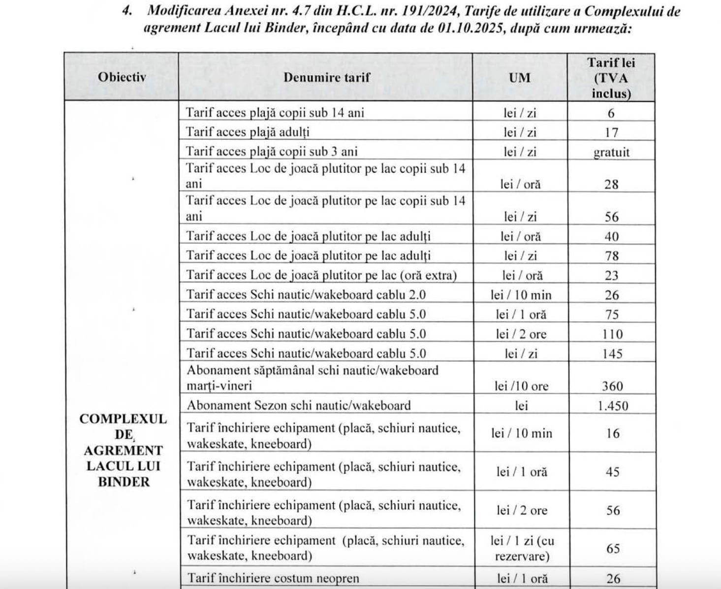 Pentru Lacul lui Binder, tariful de acces la plajă pentru adulți a crescut la 17 lei, de la 15 lei, iar tariful pentru acces la locul de joacă plutitor pe lac pentru copii sub 14 ani a crescut pentru o zi de la 50 la 56 de lei. S-a scumpit și plimbarea cu placa de SUP, de la 25 de lei o oră la 30 de lei.