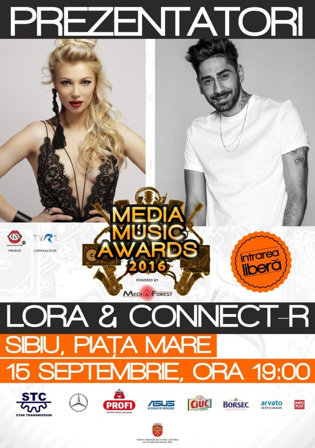 MMA: Lora si Connect-R prezintă premiile industriei muzicale româneştiÎn premieră pentru gala Media Music Awards, ediţia din acest an va fi prezentată de un duo de artişti, Lora si Connect-R vor prezenta marea noapte a muzicii româneşti, care va avea loc la Sibiu, în 15 septembrie. Vedetele se -
