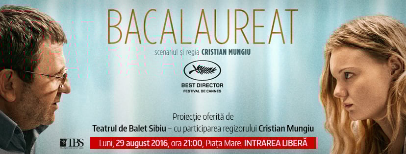 După premiera mondială de la Cannes, filmul „Bacalaureat” de Cristian Mungiu ajunge la SibiuTeatrul de Balet Sibiu prezintă luni, 29 august în Piața Mare filmul „Bacalaureat”semnat de Cristian Mungiu, ce a fost laureat cu Premiul pentru Regie la Festivalul de Film de la Cannes. Proiecția va avea loc de la ora 21.00, în -