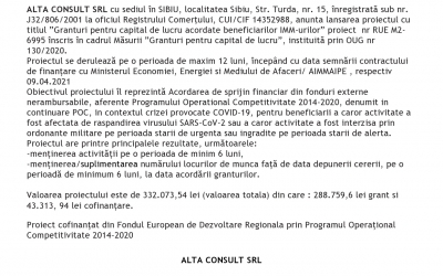 Anunț începere proiect finanțat prin Măsura 2 „ Granturi pentru capital de lucru acordate IMM-urilor” pentru societatea SC ALTA CONSULT SRL