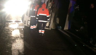 O autoutilitară a intrat într-un TIR și s-a răsturnat, pe Valea Oltului