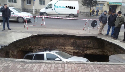 O mașină a fost „înghițită” de asfaltul surpat, la Râmnicu Sărat | foto video