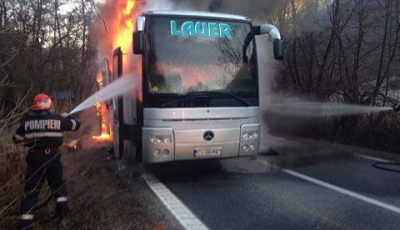 VIDEO Autocar în flăcări. Transporta 17 pasageri