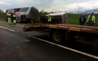 FOTO Autocar Atlassib, rasturnat pe DN1. Drum blocat intre Sibiu si Brasov