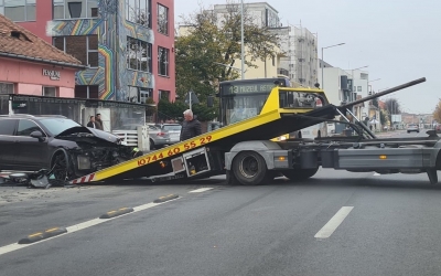 FOTO Autobuz lovit pe Calea Dumbrăvii. Tursib: ”Ambele mijloace de transport au suferit avarii considerabile”